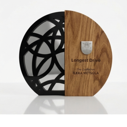 šskirtinis „Apskritimas A002“ apdovanojimas – tai modernios estetikos ir natūralumo dermė, sukurta vertinantiems kokybę bei tvarumą. Pagrindinis šio prizo akcentas yra tvirtas ąžuolo medienos korpusas, kurio centre įmontuotas šlifuotas veidrodis. Veidrodinis paviršius suteikia gaminiui gylio bei simbolizuoja skaidrumą, o ant jo esantis tekstas primena apie asmeninio indėlio svarbą. Apatinėje dalyje pritvirtinta elegantiška šlifuoto metalo plokštelė, skirta aukščiausios kokybės personalizavimui – vardams, datoms ar logotipams įamžinti. Šis rankų darbo kūrinys idealiai tinka įmonių jubiliejams, metų darbuotojų nominacijoms ar kaip padėka verslo partneriams už ilgalaikį bendradarbiavimą. Tai ne tik prizas, bet ir reprezentatyvus interjero elementas.