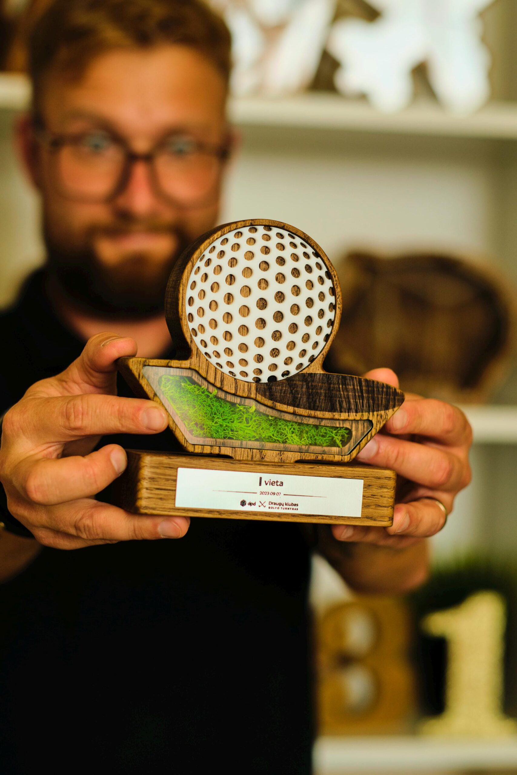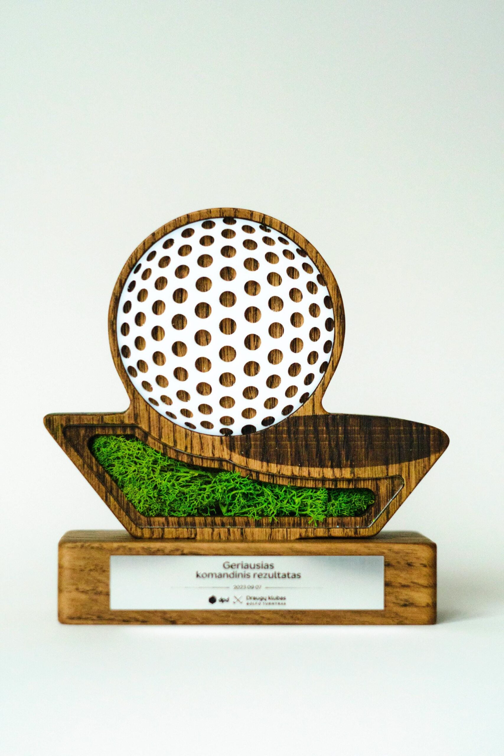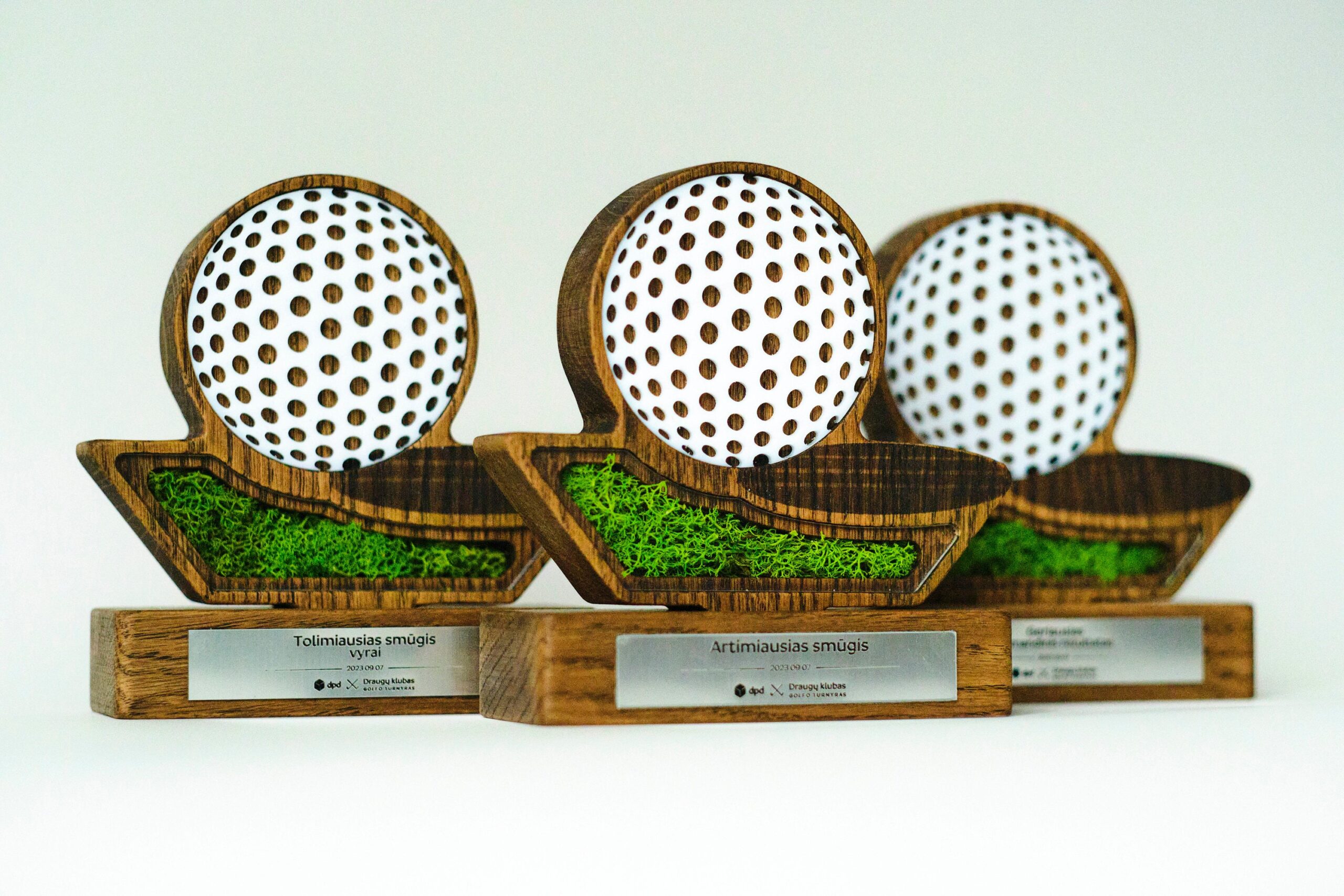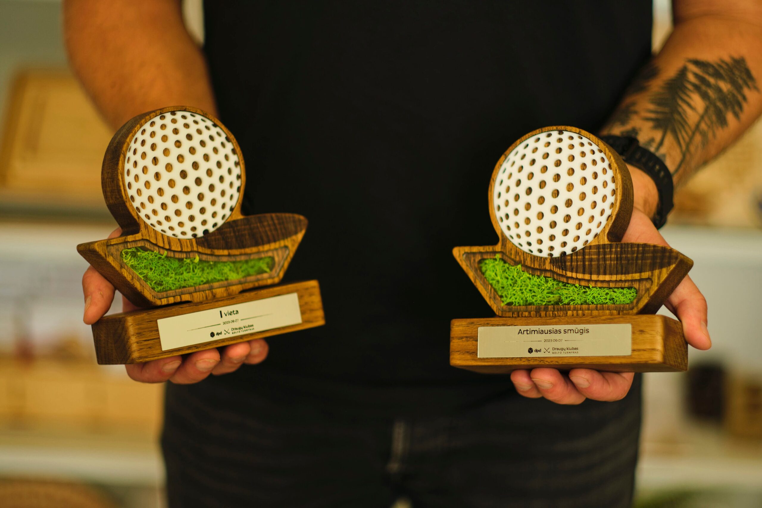 Aukščiausios klasės apdovanojimai, sukurti specialiai golfo turnyrams, klubų varžyboms ir prestižiniams čempionatams. Šie gaminiai pasižymi elegantiškomis linijomis ir medžiagų kokybe, atitinkančia golfo etiketą. Individualaus dizaino kūrimo metu naudojami stilizuoti golfo žaidėjo siluetai, kamuoliuko motyvai ar rafinuoti akrilo ir medžio deriniai, simbolizuojantys gamtos ir žaidimo dermę. Statulėlės gali būti papildytos stabilizuotų samanų akcentais, atkartojančiais žaliuosius laukus („green“ zonas), arba prabangiu veidrodiniu akrilu. Lazerinis graviravimas ant medinio pagrindo ar skaidraus paviršiaus leidžia tiksliai įamžinti nominacijas, tokias kaip „Longest Drive“, „Nearest to the Pin“ ar turnyro nugalėtojo vardą. Tai reprezentatyvūs trofėjai, kurie ne tik papuoš nugalėtojo kolekciją, bet ir taps ilgaamžiu pasiekimo simboliu.