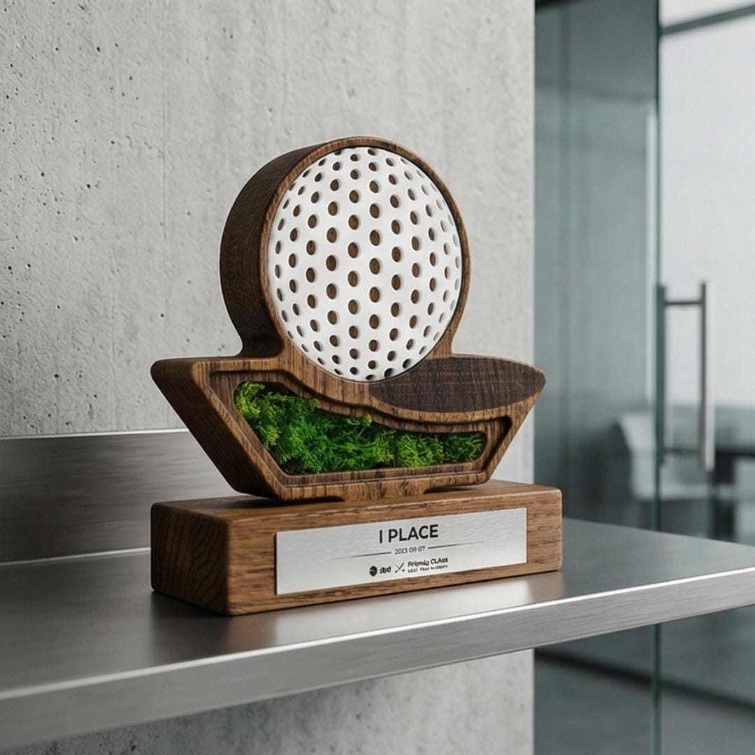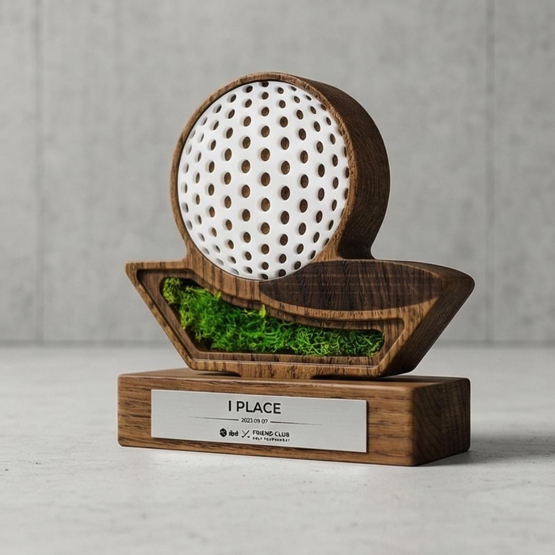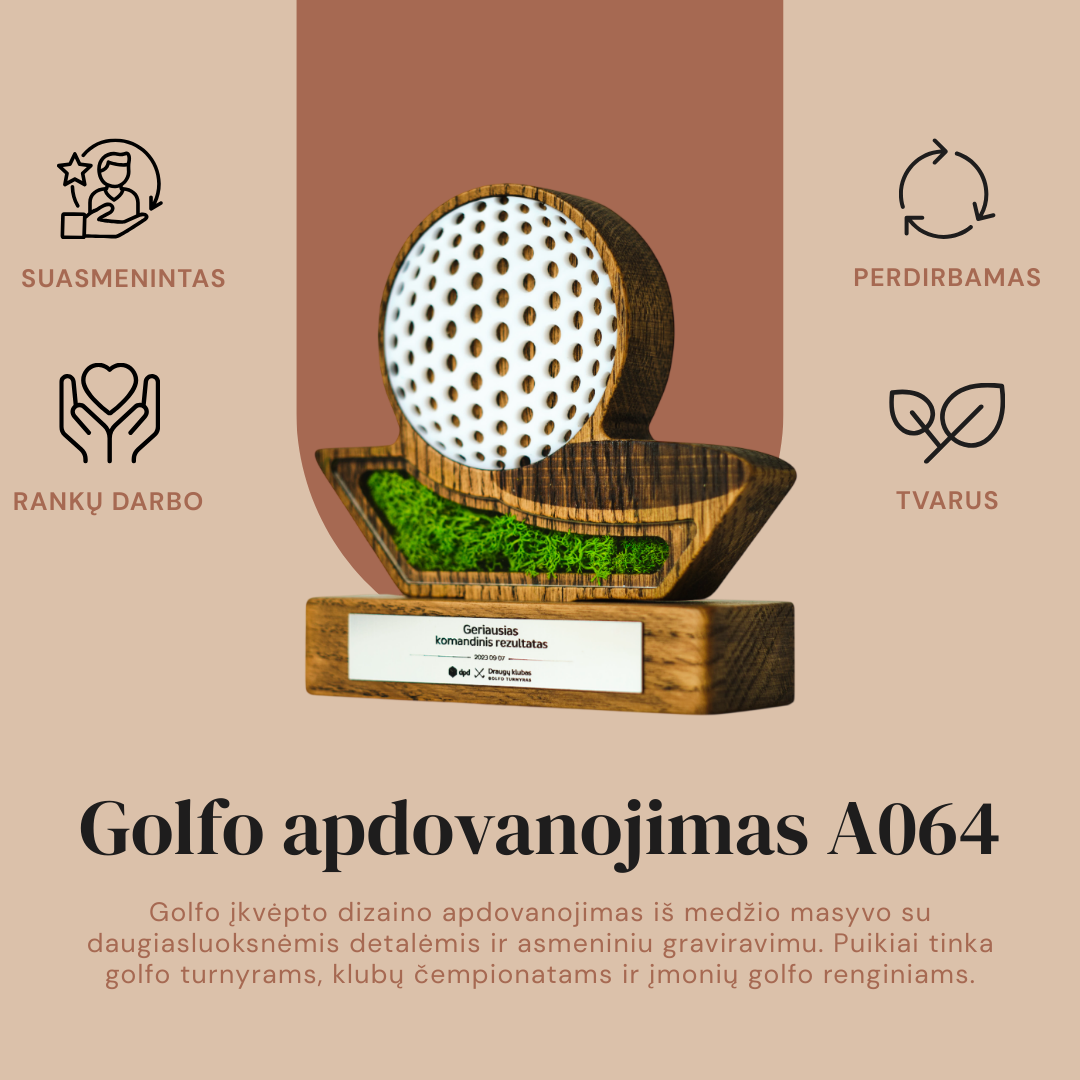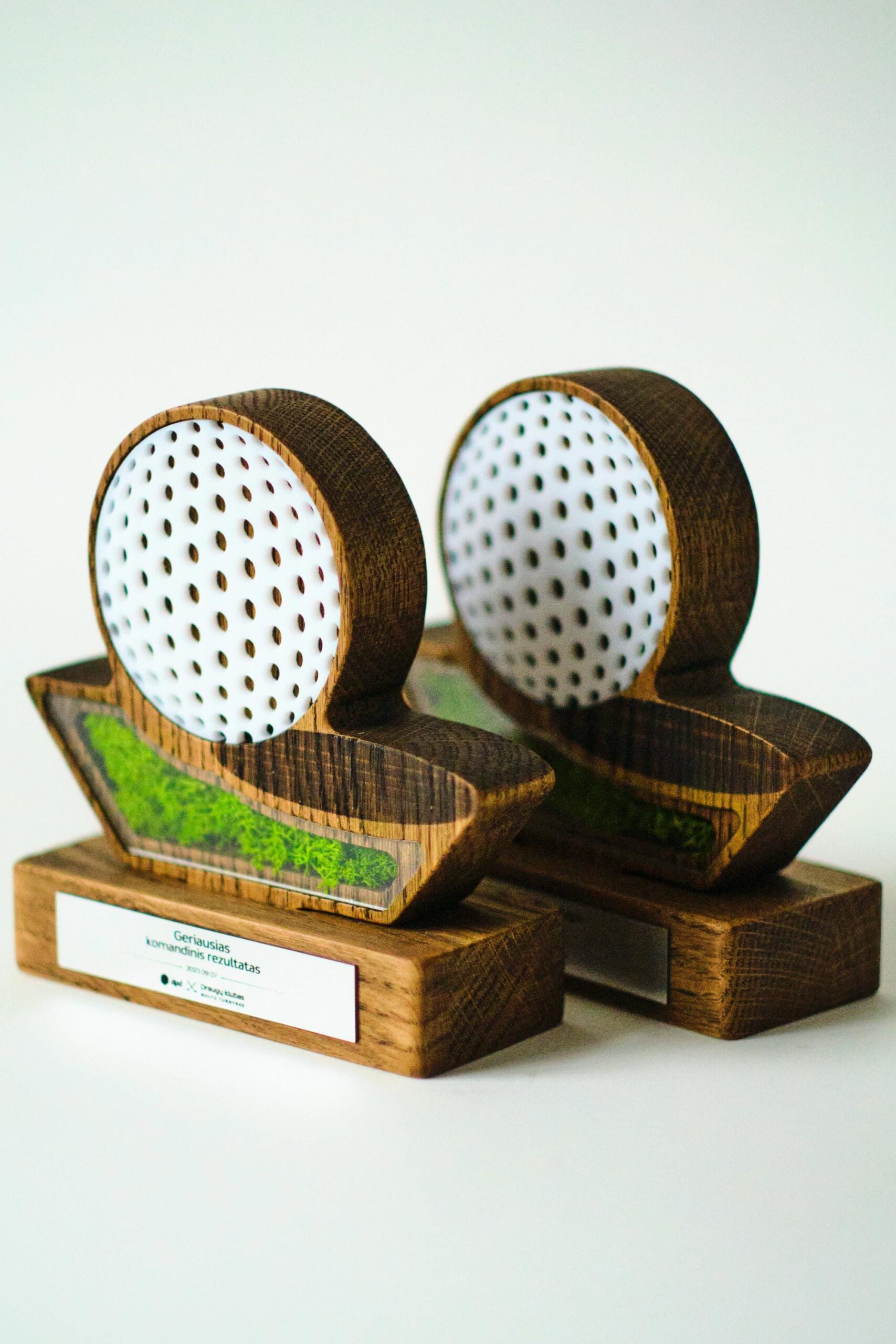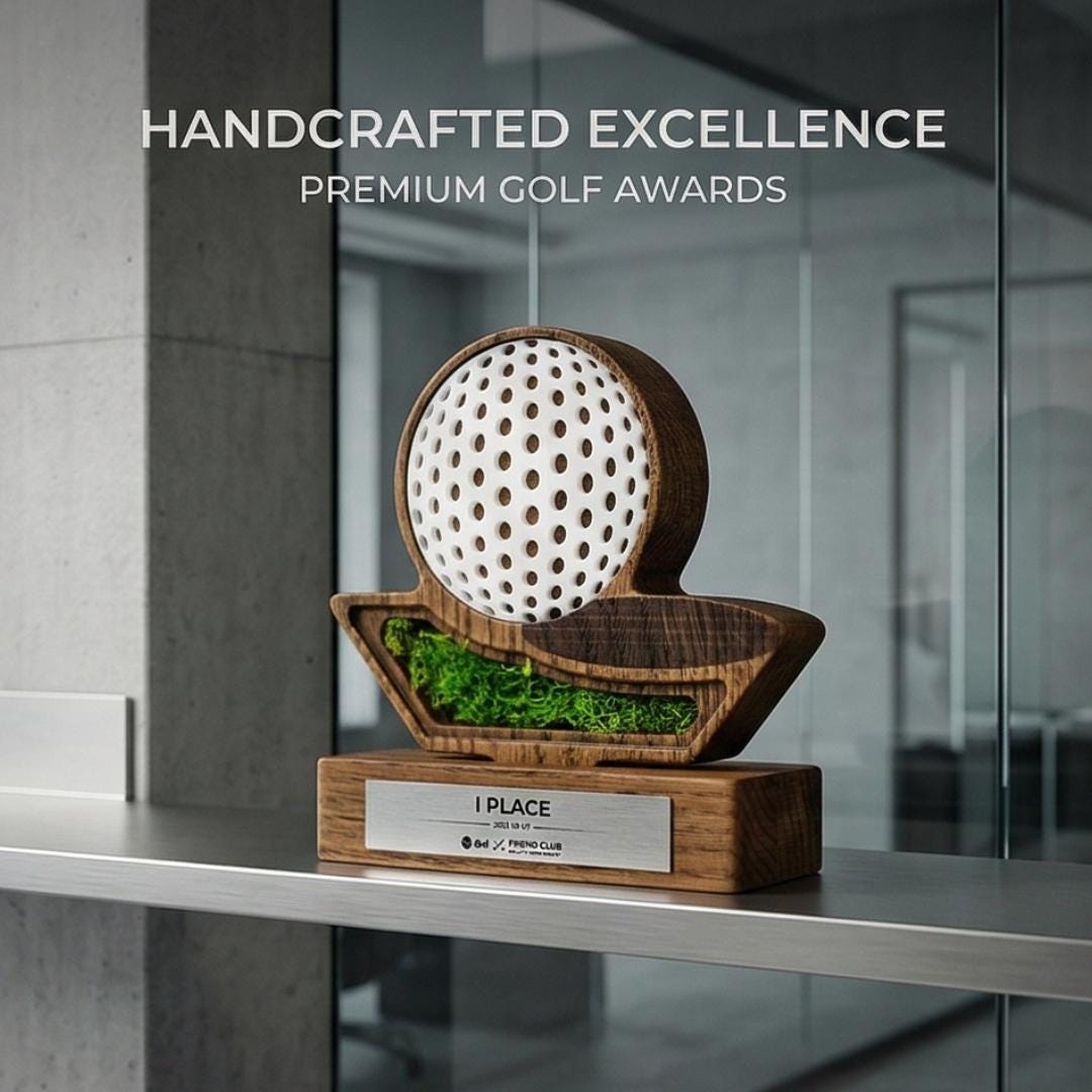 Aukščiausios klasės apdovanojimai, sukurti specialiai golfo turnyrams, klubų varžyboms ir prestižiniams čempionatams. Šie gaminiai pasižymi elegantiškomis linijomis ir medžiagų kokybe, atitinkančia golfo etiketą. Individualaus dizaino kūrimo metu naudojami stilizuoti golfo žaidėjo siluetai, kamuoliuko motyvai ar rafinuoti akrilo ir medžio deriniai, simbolizuojantys gamtos ir žaidimo dermę. Statulėlės gali būti papildytos stabilizuotų samanų akcentais, atkartojančiais žaliuosius laukus („green“ zonas), arba prabangiu veidrodiniu akrilu. Lazerinis graviravimas ant medinio pagrindo ar skaidraus paviršiaus leidžia tiksliai įamžinti nominacijas, tokias kaip „Longest Drive“, „Nearest to the Pin“ ar turnyro nugalėtojo vardą. Tai reprezentatyvūs trofėjai, kurie ne tik papuoš nugalėtojo kolekciją, bet ir taps ilgaamžiu pasiekimo simboliu.