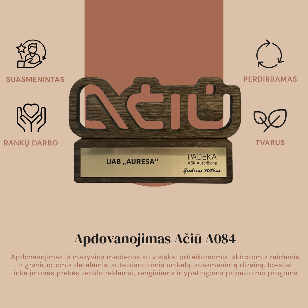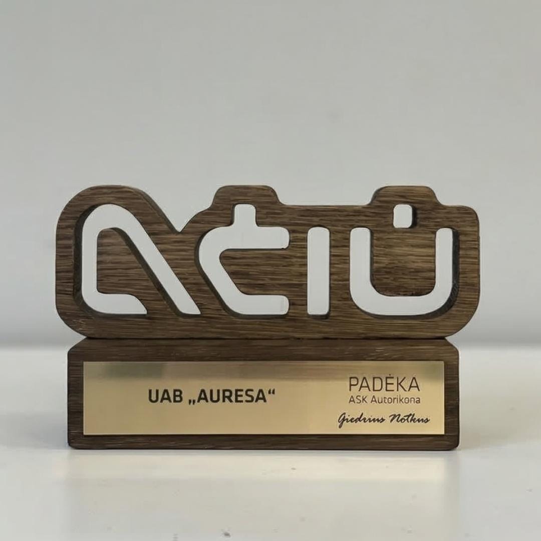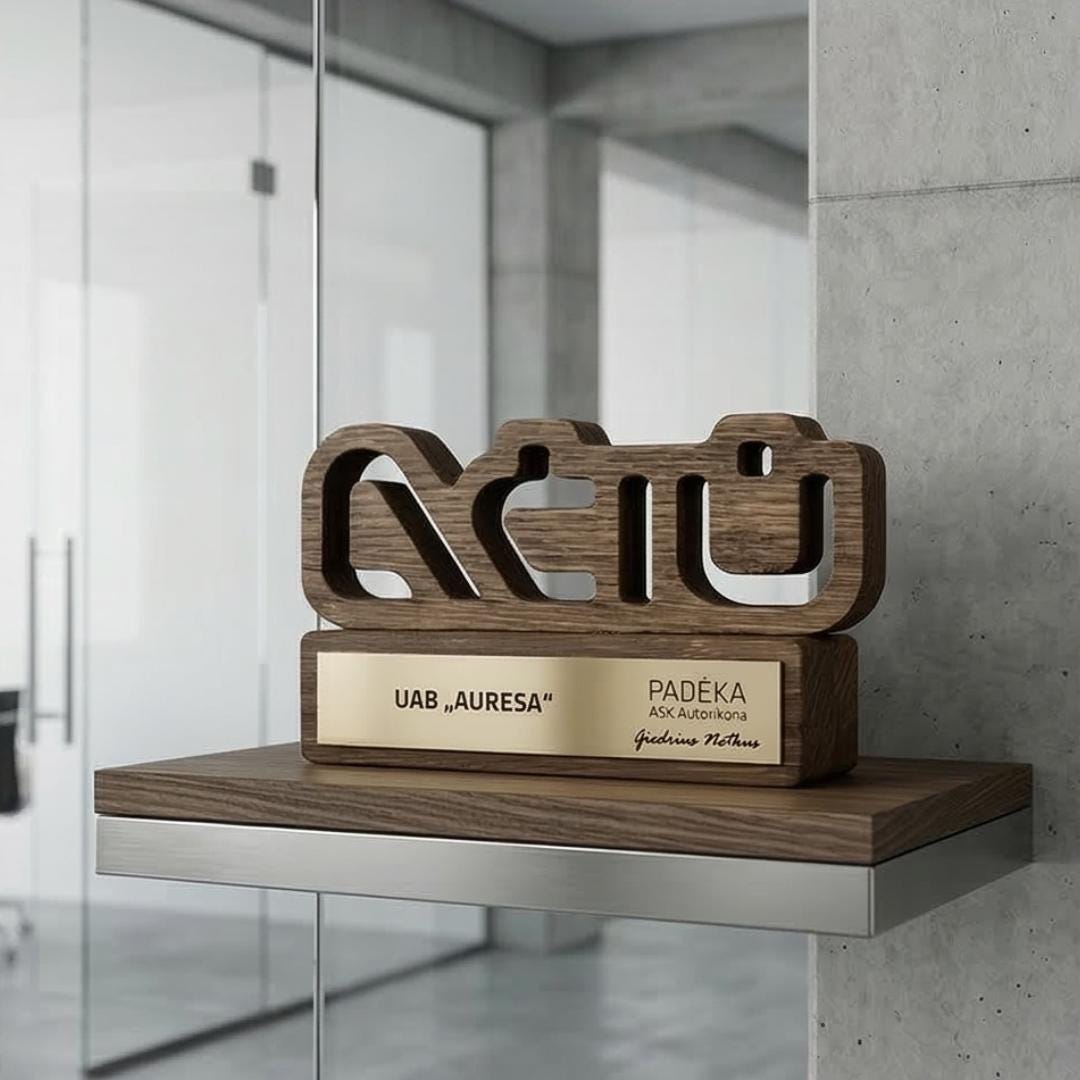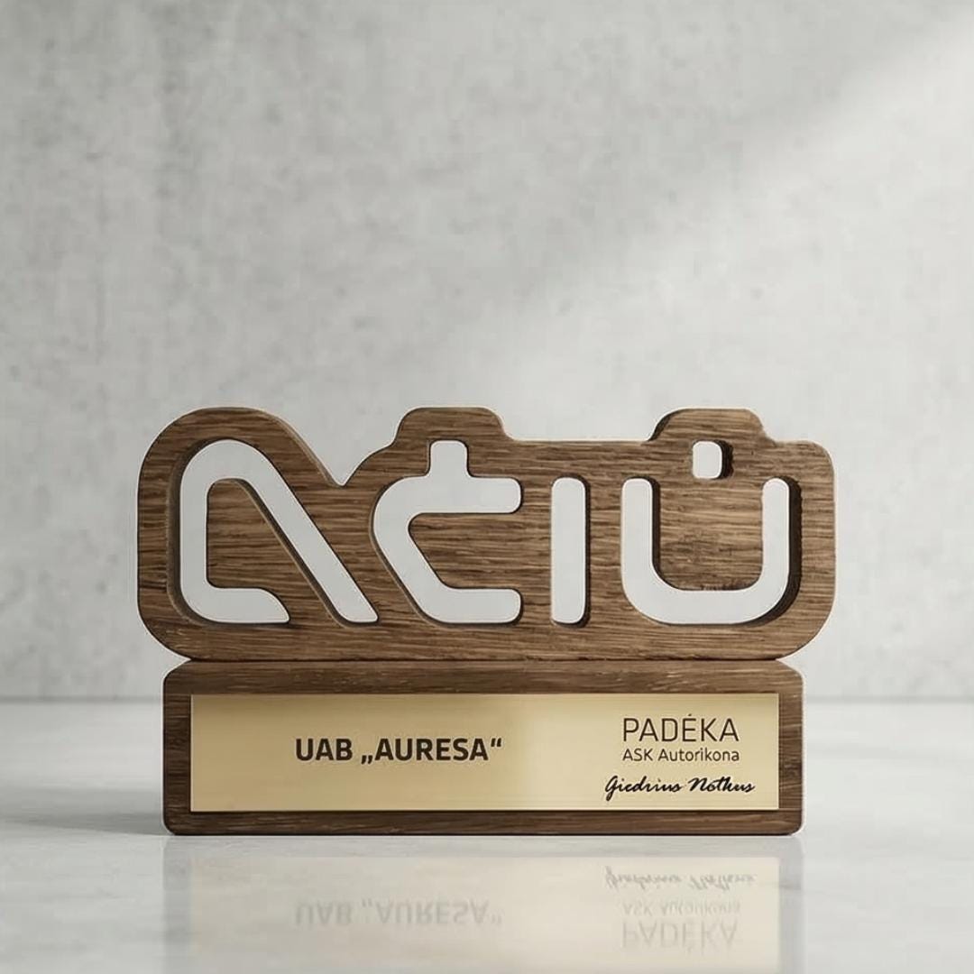 Personalizuotas medžio ir akrilo apdovanojimas, pasižymintis unikaliu dizainu ir precizišku graviravimu. Idealus pasirinkimas išskirtiniams verslo ar asmeniniams įvertinimams.