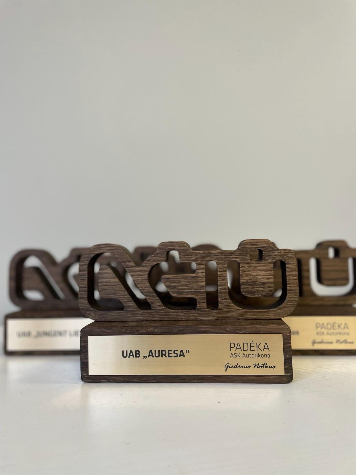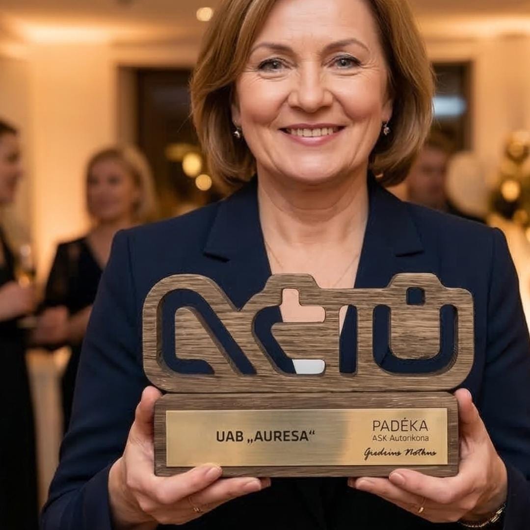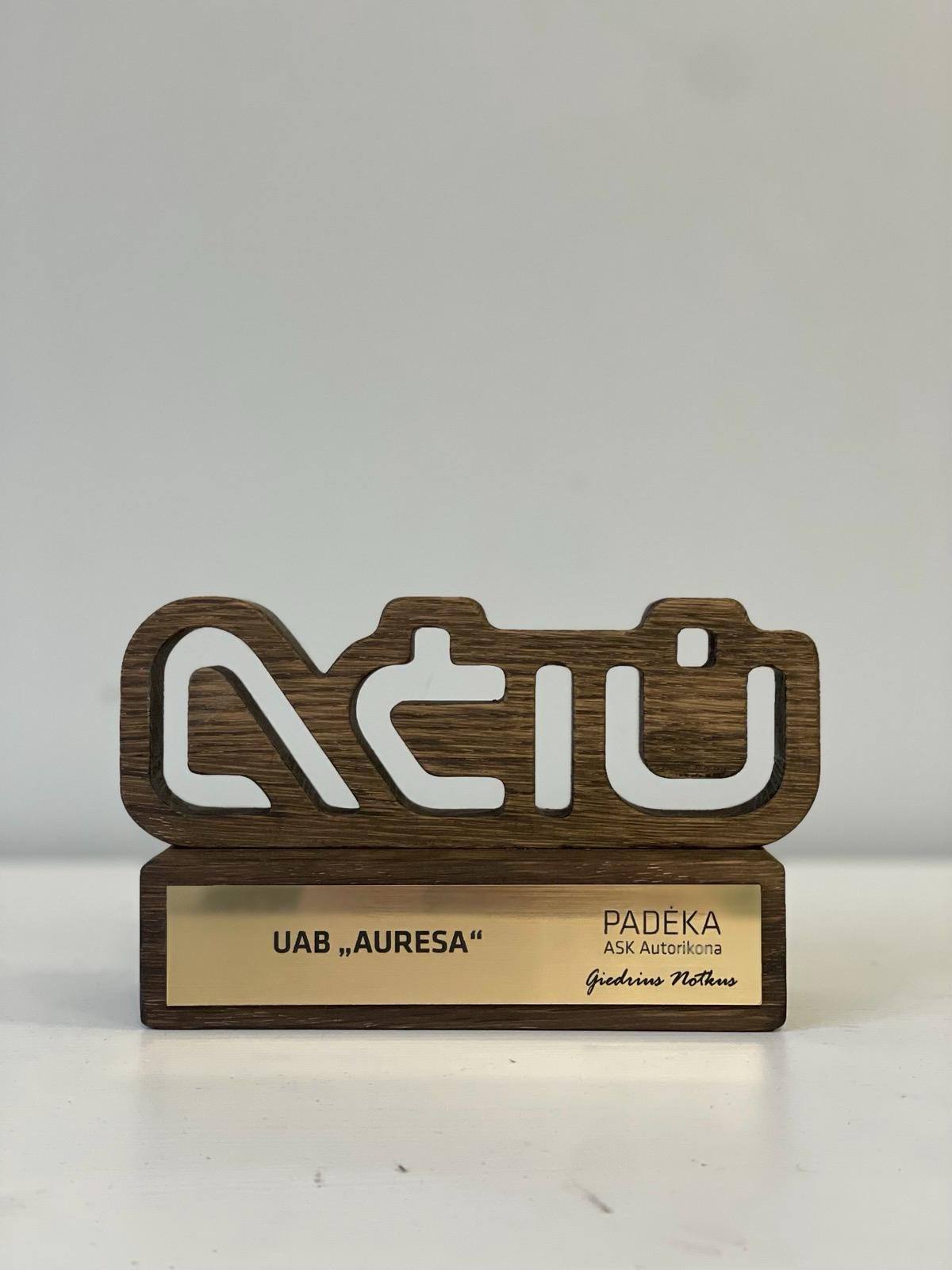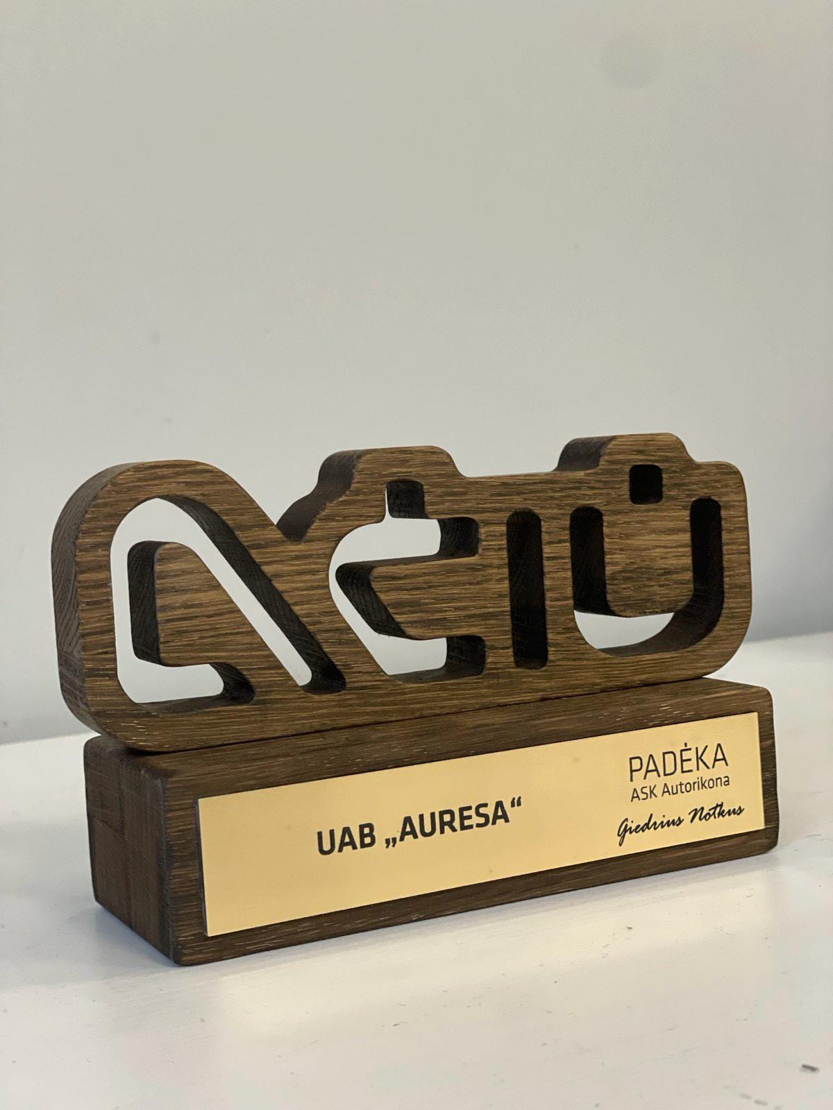 Personalizuotas medžio ir akrilo apdovanojimas, pasižymintis unikaliu dizainu ir precizišku graviravimu. Idealus pasirinkimas išskirtiniams verslo ar asmeniniams įvertinimams.