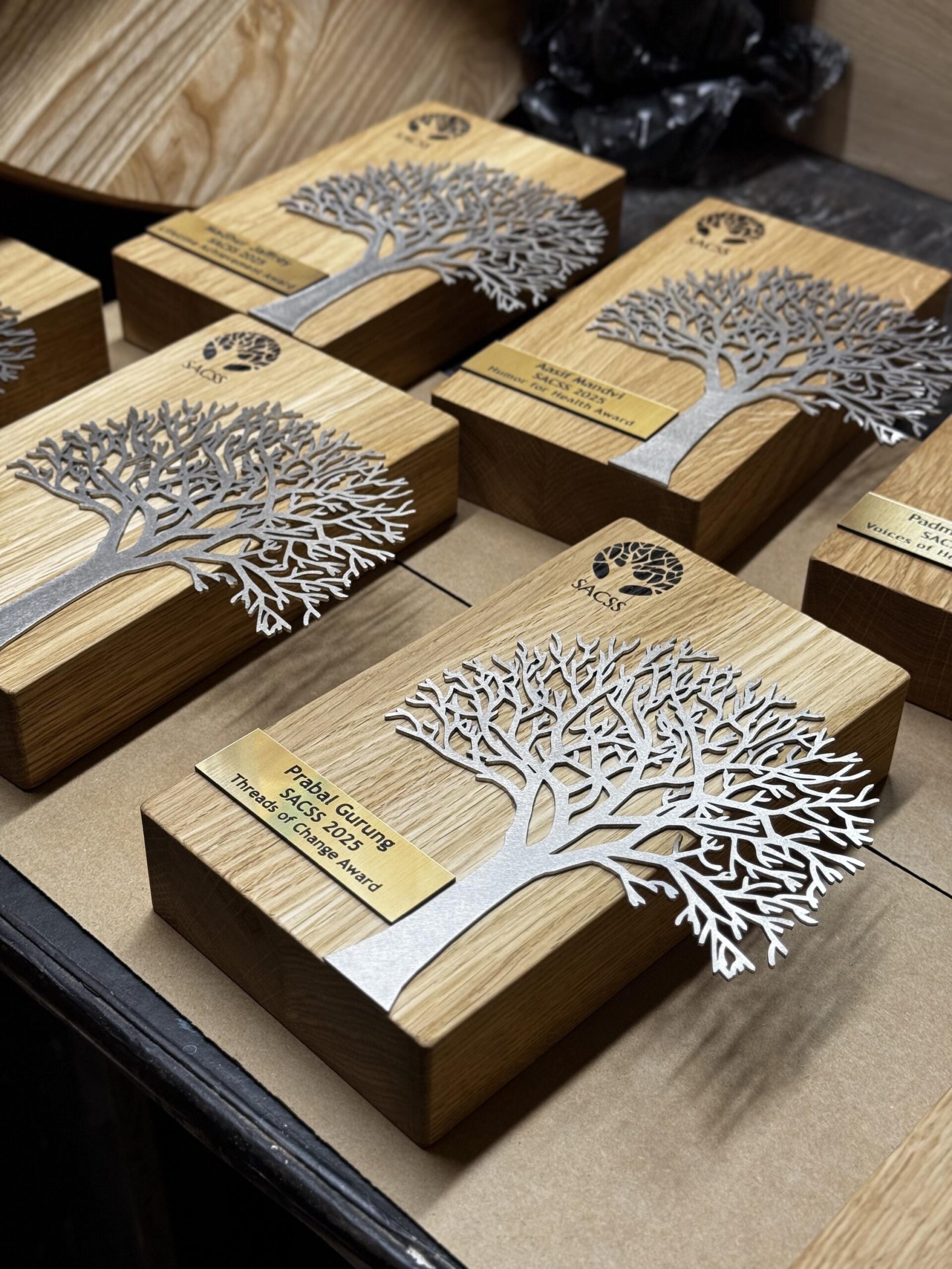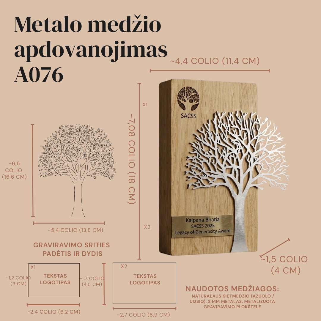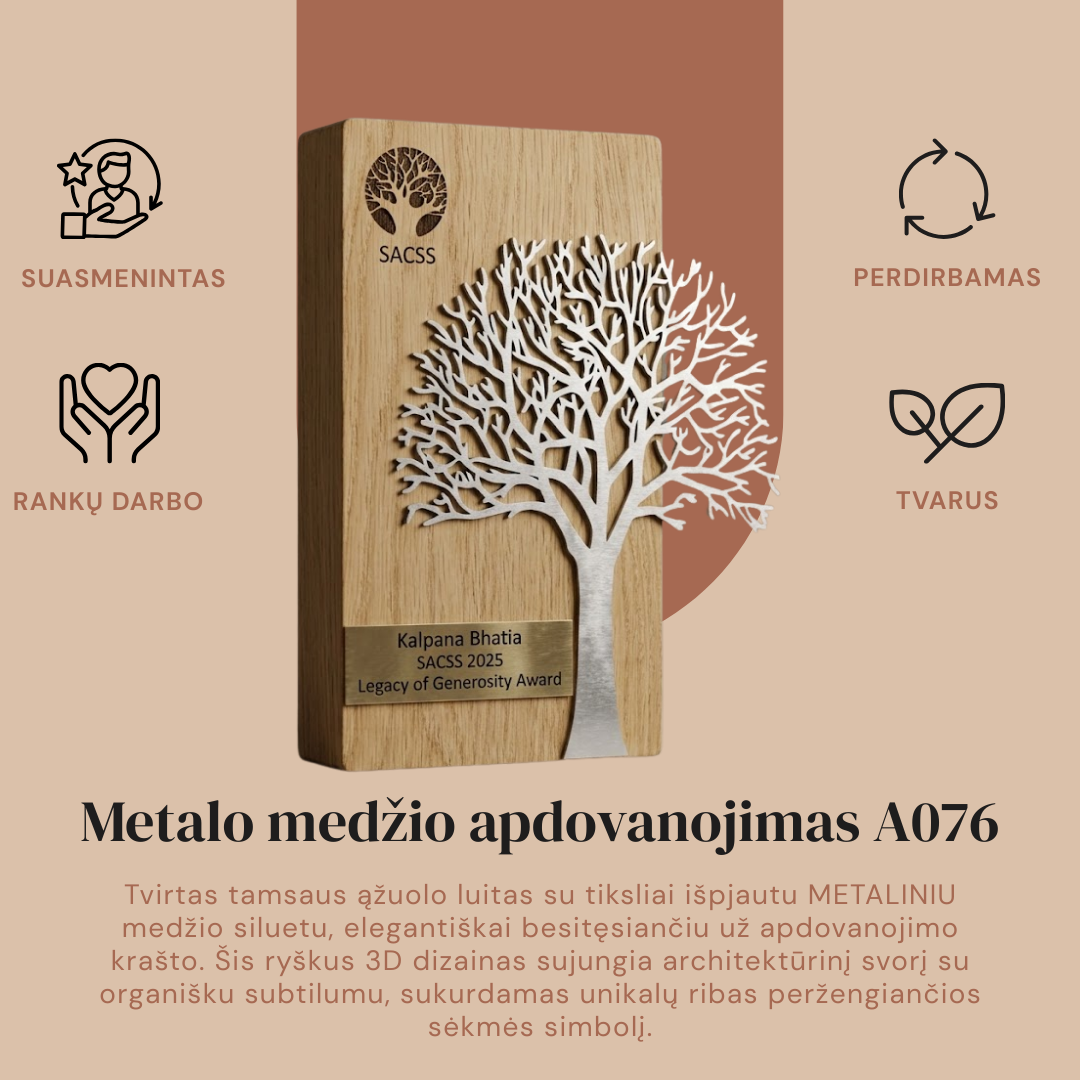 Simbolinis ir estetiškas apdovanojimas, pasižymintis unikaliu medžio siluetu. Šis gaminys dažniausiai kuriamas derinant natūralaus medžio tekstūras su moderniomis akrilo detalėmis, taip sukuriant gylio ir ilgaamžiškumo pojūtį. Medžio motyvas simbolizuoja augimą, stiprybę ir stabilumą, todėl šis apdovanojimas idealiai tinka įmonių jubiliejams, ilgą stažą turintiems darbuotojams pagerbti ar padėkoms už indėlį į bendruomenės veiklą. Kiekviena detalė – nuo lapų formos iki šaknų linijų – yra preciziškai išpjauta lazeriu. Individualus graviravimas ant pagrindo arba tiesiai ant medžio vainiko leidžia įamžinti svarbias datas, vardus bei nuoširdžius padėkos žodžius. Tai ne tik prizas, bet ir prasmingas meno kūrinys, papuošiantis bet kurį biurą ar namų erdvę.