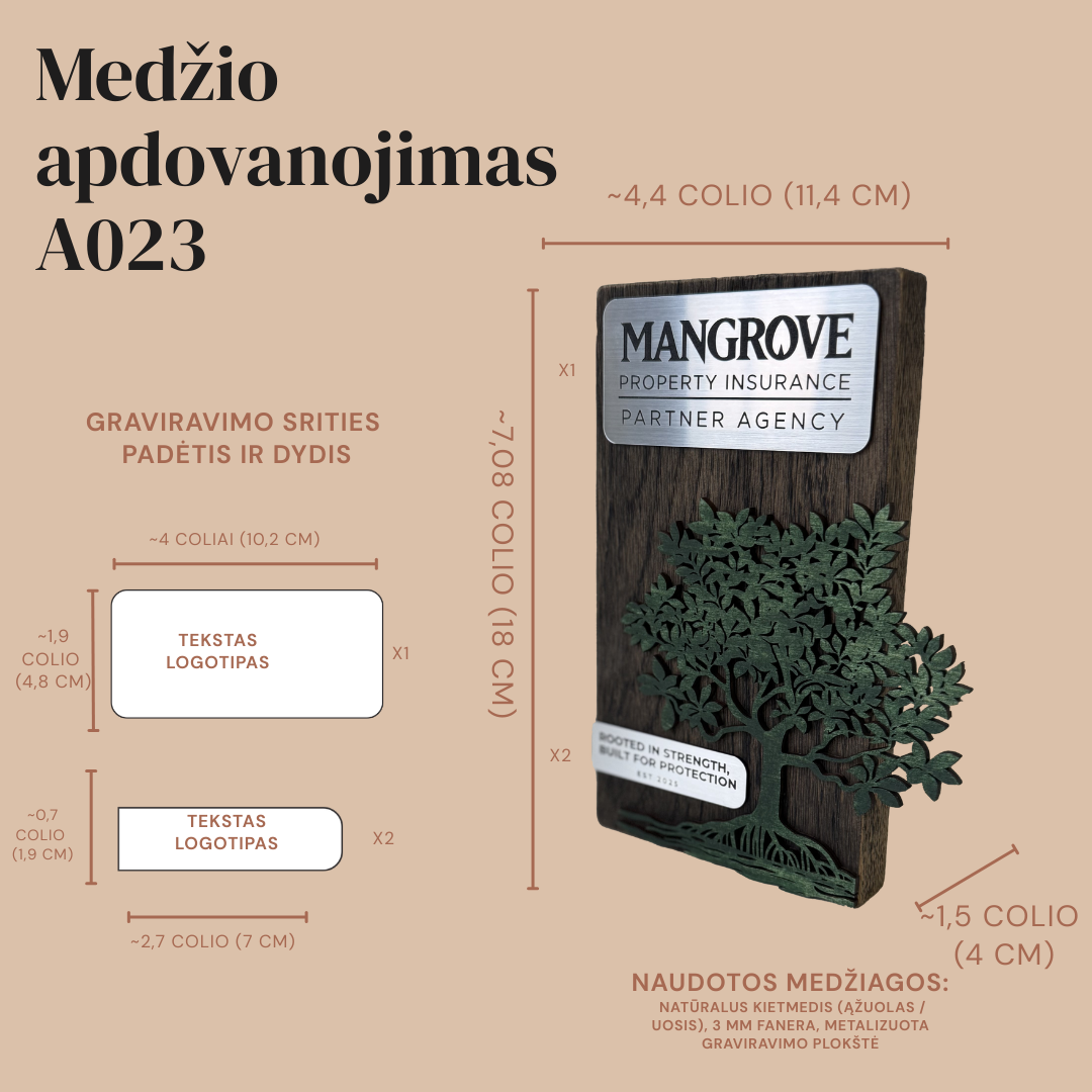 Apdovanojimas yra pilnai pritaikomas individualiems poreikiams: ant medinio paviršiaus gali būti graviruojami logotipai, o speciali lentelė skirta detaliai informacijai, tekstui ar nominacijai įamžinti. Tai rankų darbo gaminys, orientuotas į ekologiją ir ilgaamžiškumą, todėl idealiai tinka mokslo pasiekimams, aplinkosaugos projektams ar įmonių vertybėms pabrėžti. Estetiškas kontrastas tarp tamsaus ažuolo ir šviesaus medžio detalių suteikia prizui prabangos ir solidumo pojūtį.