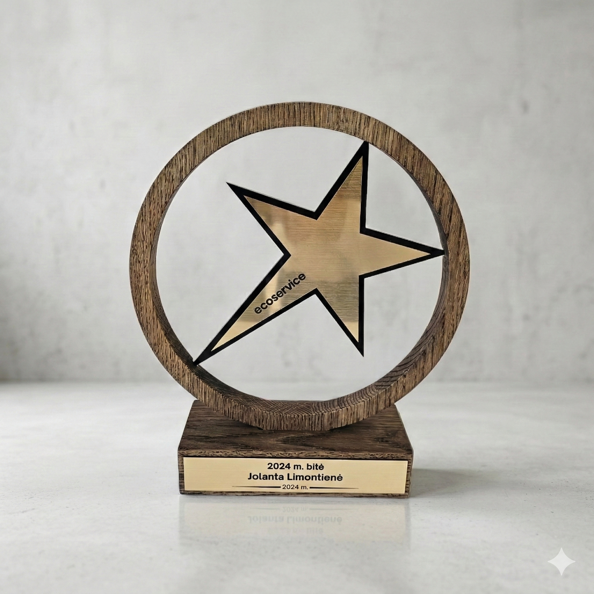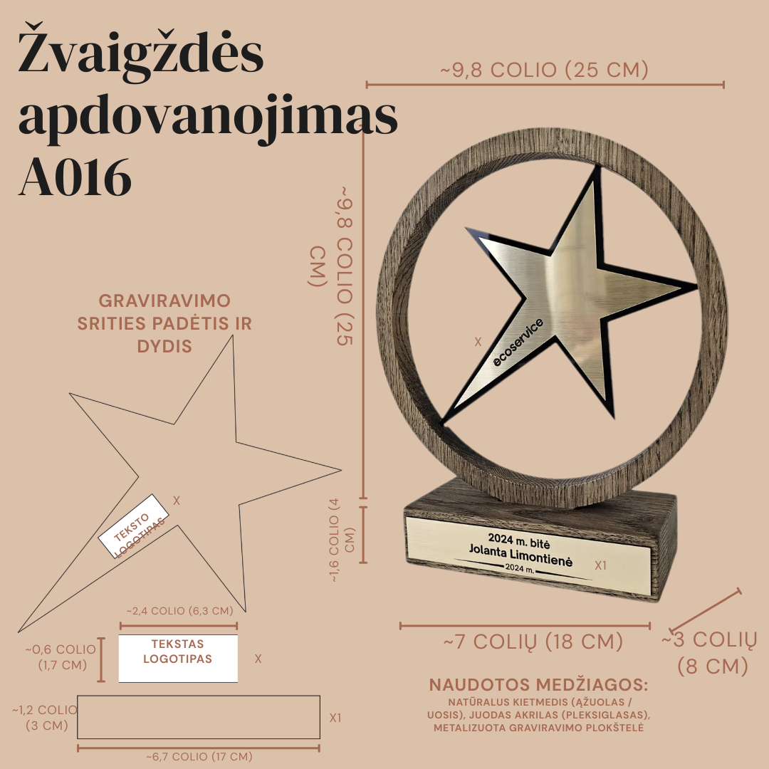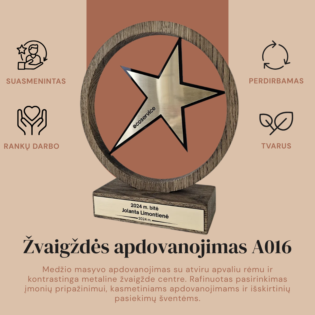 Šis modelis yra itin vertinamas dėl savo tvarumo ir natūralių medžiagų panaudojimo. Metalinis žvaigždės paviršius bei ant pagrindo esanti lentelė suteikia plačias personalizavimo galimybes – čia gali būti išgraviruotas ne tik tekstas, bet ir įmonės ar rėmėjų logotipai. Tai idealus pasirinkimas „Metų darbuotojo“, „Geriausio pardavėjo“ ar kūrybinių konkursų nugalėtojų pagerbimui, suteikiantis apdovanojamam asmeniui išskirtinio vertinimo pojūtį.