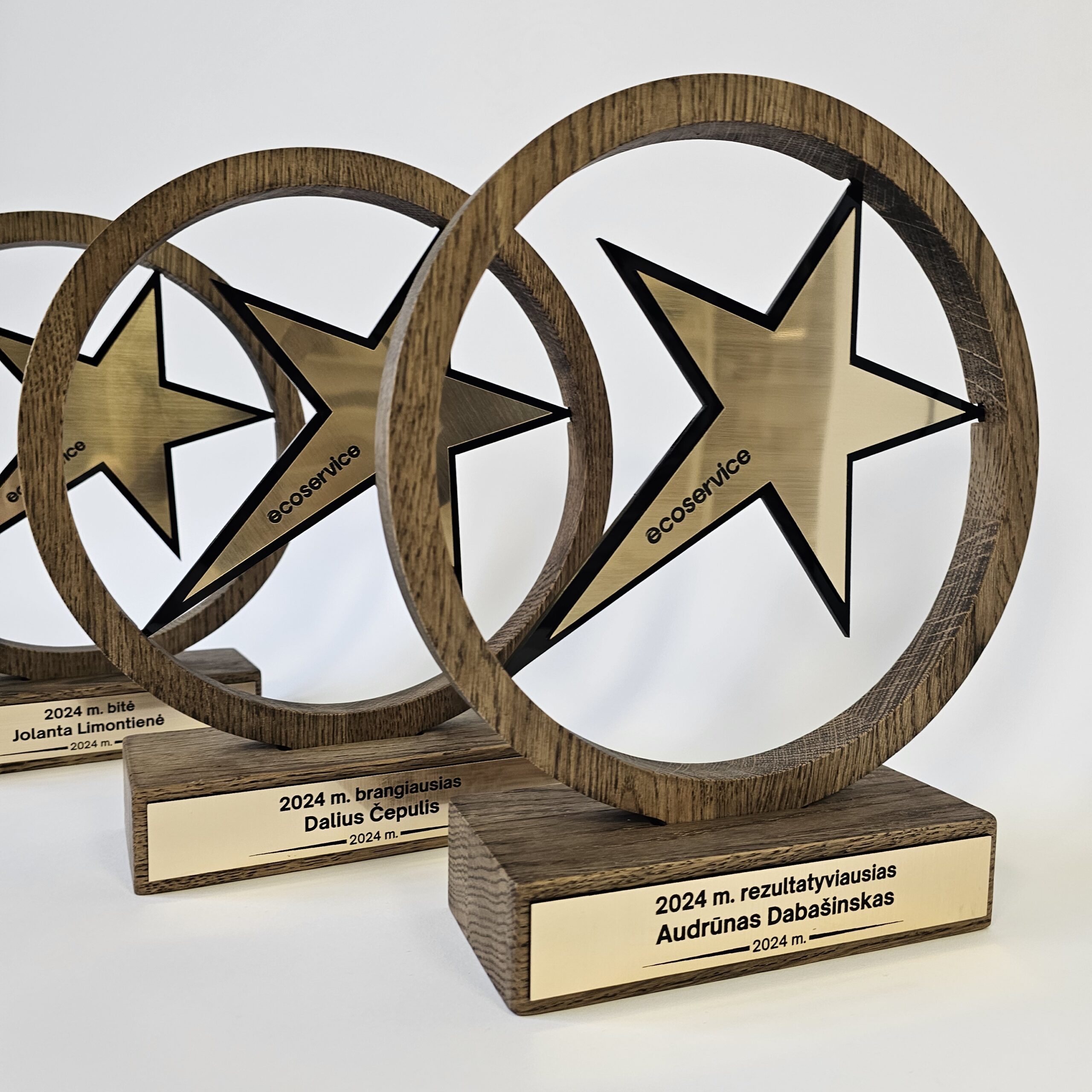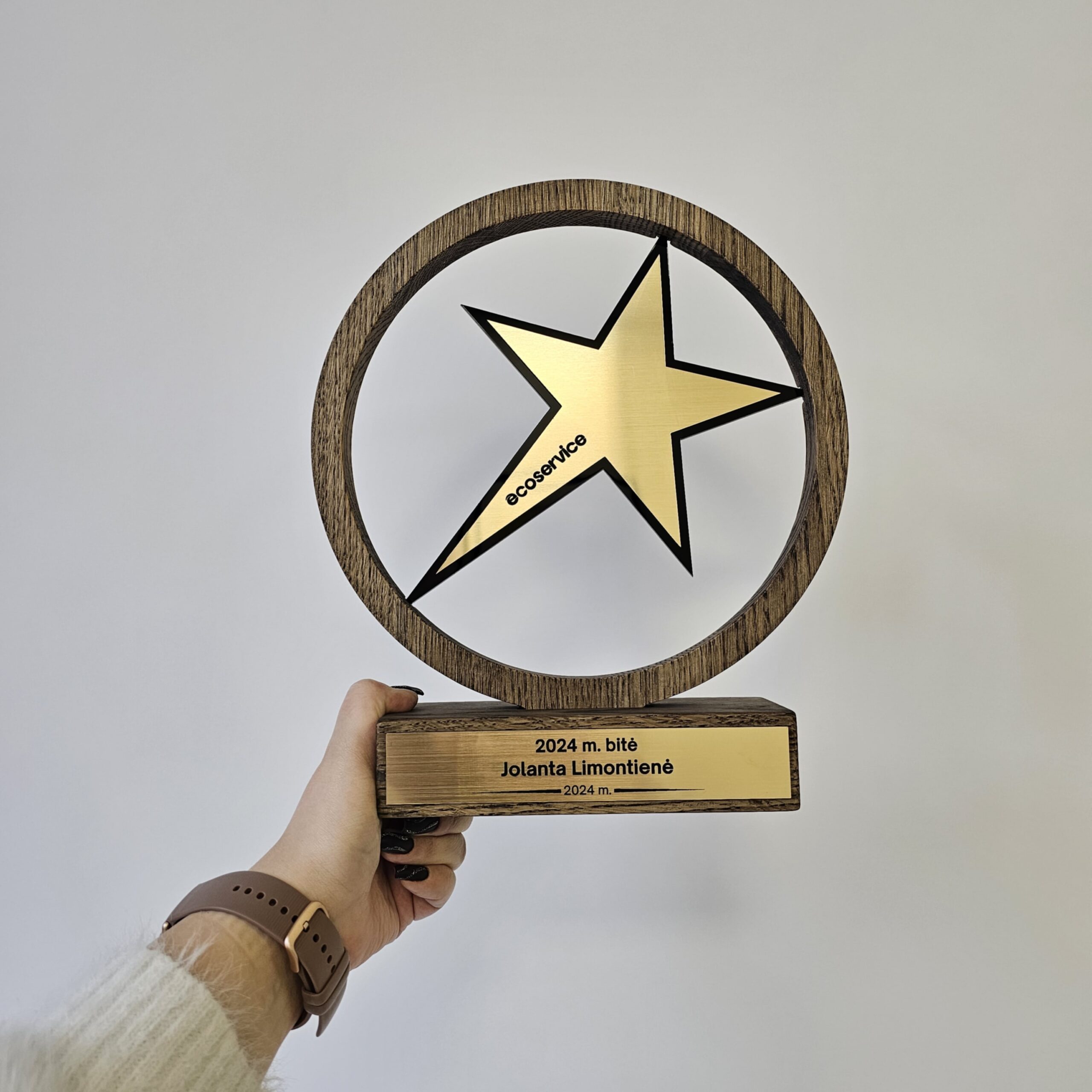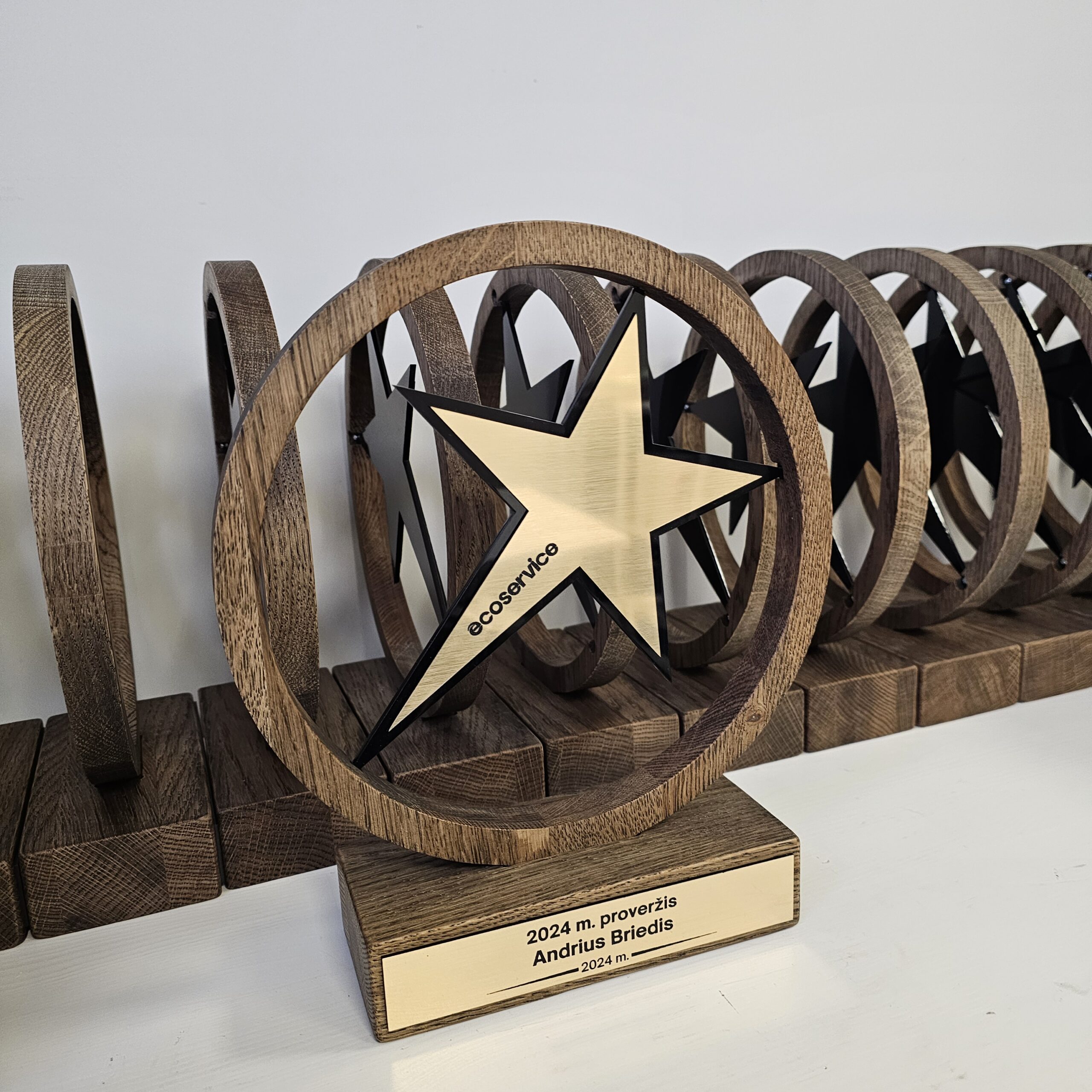 Šis modelis yra itin vertinamas dėl savo tvarumo ir natūralių medžiagų panaudojimo. Metalinis žvaigždės paviršius bei ant pagrindo esanti lentelė suteikia plačias personalizavimo galimybes – čia gali būti išgraviruotas ne tik tekstas, bet ir įmonės ar rėmėjų logotipai. Tai idealus pasirinkimas „Metų darbuotojo“, „Geriausio pardavėjo“ ar kūrybinių konkursų nugalėtojų pagerbimui, suteikiantis apdovanojamam asmeniui išskirtinio vertinimo pojūtį.