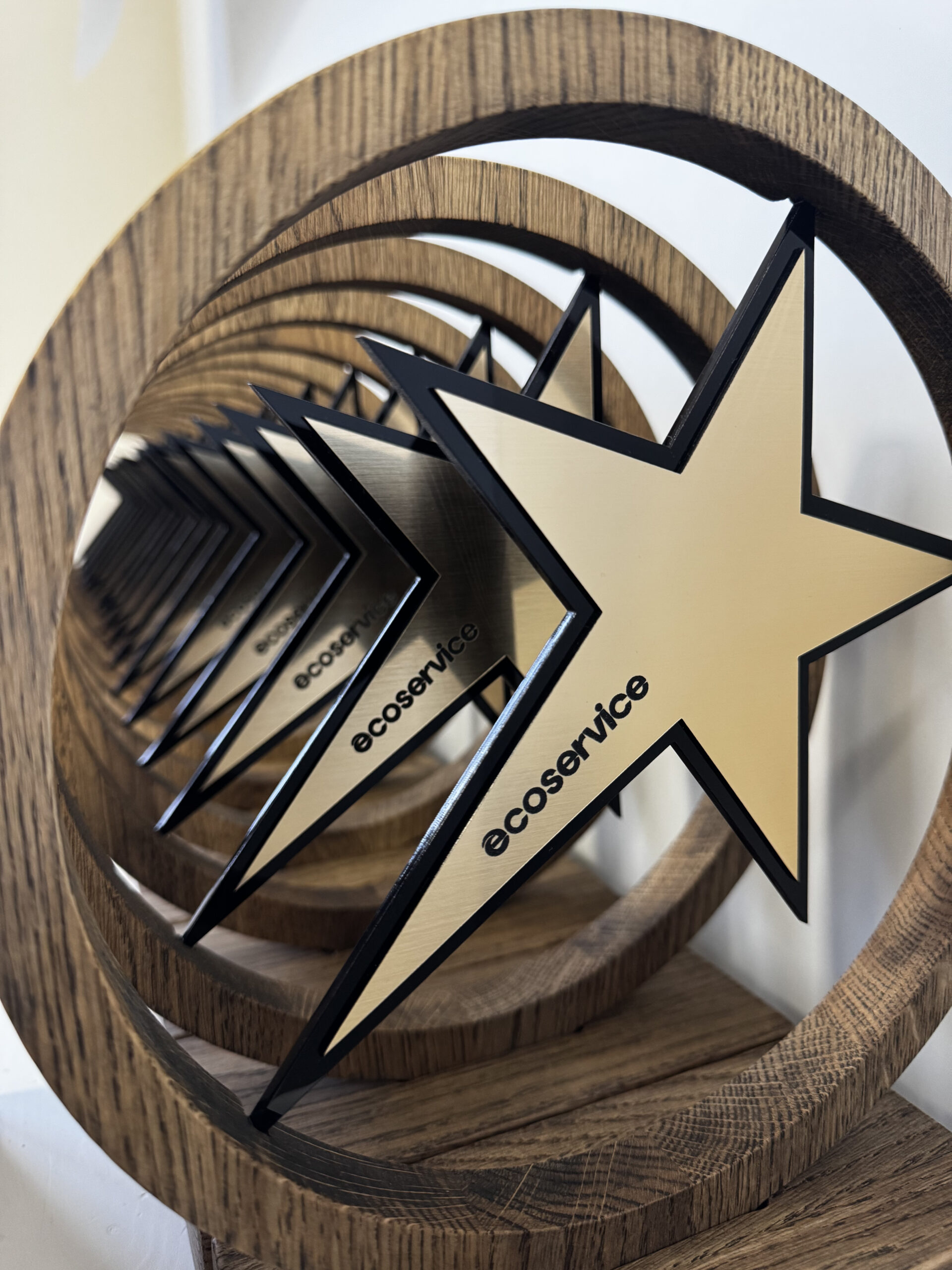 Apdovanojimas „Žvaigždė rėme“ A016 – tai vizualiai lengvas, tačiau prasmingas rankų darbo kūrinys, sukurtas pagerbti ryškiausius talentus ir lyderius. Gaminio pagrindą sudaro preciziškai apdirbtas tamsaus medžio masyvo žiedas, kurio viduje „sklendžia“ poliruoto metalo žvaigždė. Šis architektūrinis sprendimas sukuria modernią estetiką, kuri puikiai dera tiek prie šiuolaikinio biuro interjero, tiek prie iškilmingos renginio scenos.