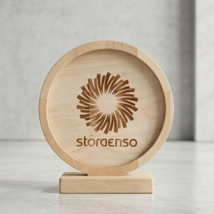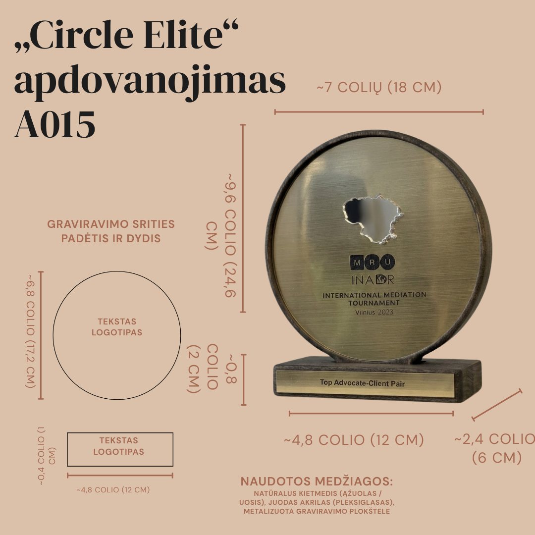 „Circle Elite“ A015 – tai prestižinis, rankų darbo apdovanojimas, kuriame meistriškai susipina natūralios medžiagos ir modernios technologijos. Tamsios medienos masyvo korpusas rėmina solidų, sendintos bronzos atspalvio metalinį diską, sukuriant prabangos ir ilgaamžiškumo pojūtį. Išskirtinis šio modelio akcentas – centrinis 3D logotipas (pavyzdyje – Lietuvos kontūras), kuris suteikia gaminiui architektūrinio gylio ir unikalumo.
