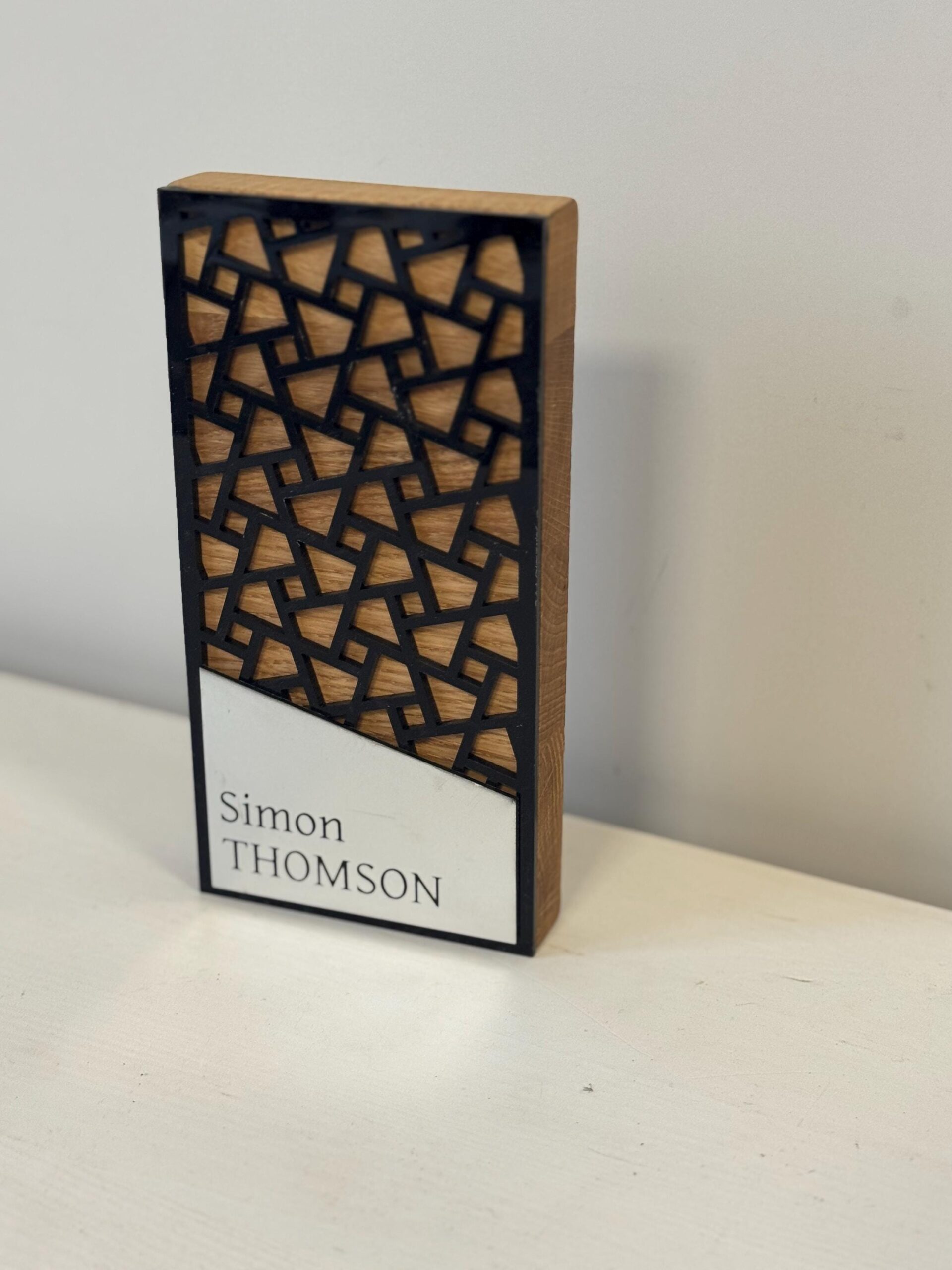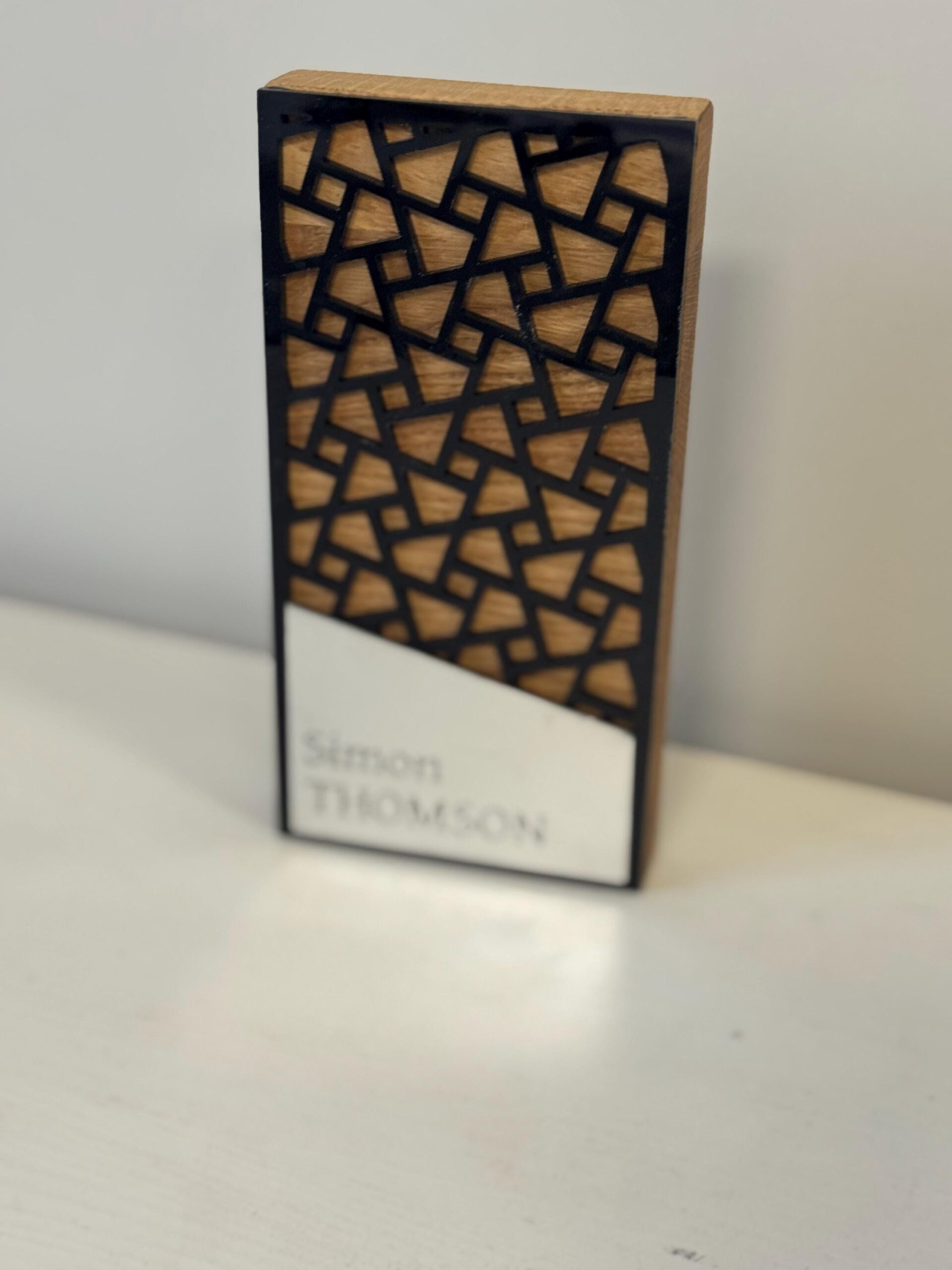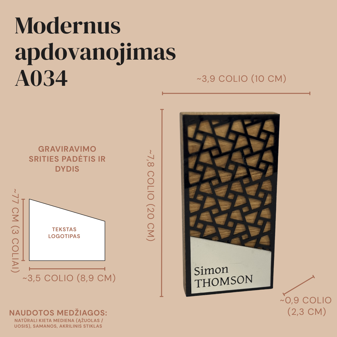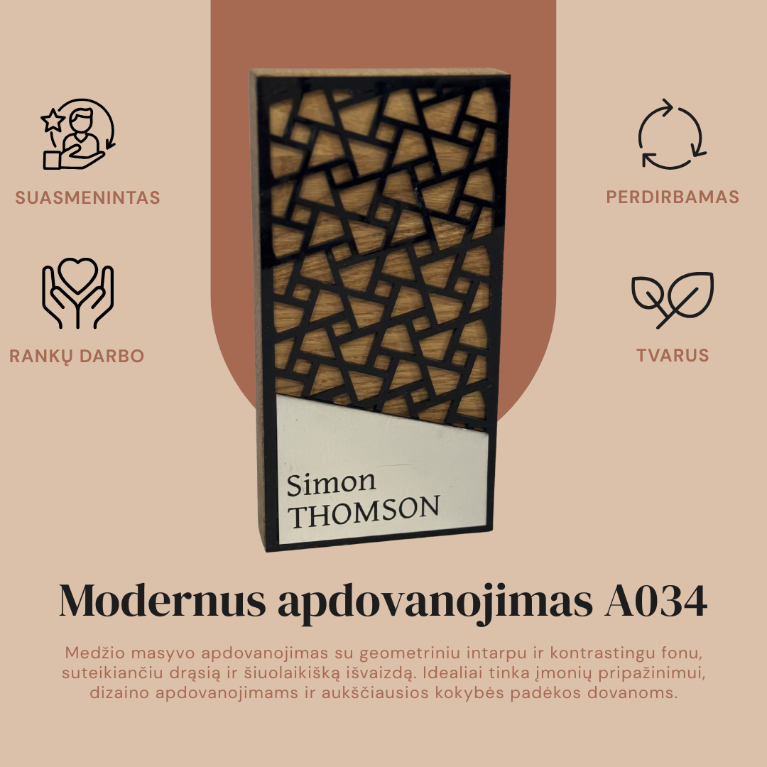 Išskirtinis modernus apdovanojimas A034 yra aukščiausios kokybės meistriškumo ir šiuolaikinio dizaino sintezė. Šis 20 cm aukščio trofėjus gaminamas iš natūralios kietos medienos (ąžuolo arba uosio), kuri suteikia gaminiui solidumo ir ilgaamžiškumo. Pagrindinis estetinio dizaino elementas – preciziškai išpjautas juodas geometrinis raštas, kuris sukuria prabangų kontrastą su po juo esančia natūralia medžio tekstūra. Šis sluoksniuotas vaizdas suteikia gaminiui gilumo ir išskirtinio modernumo pojūtį.