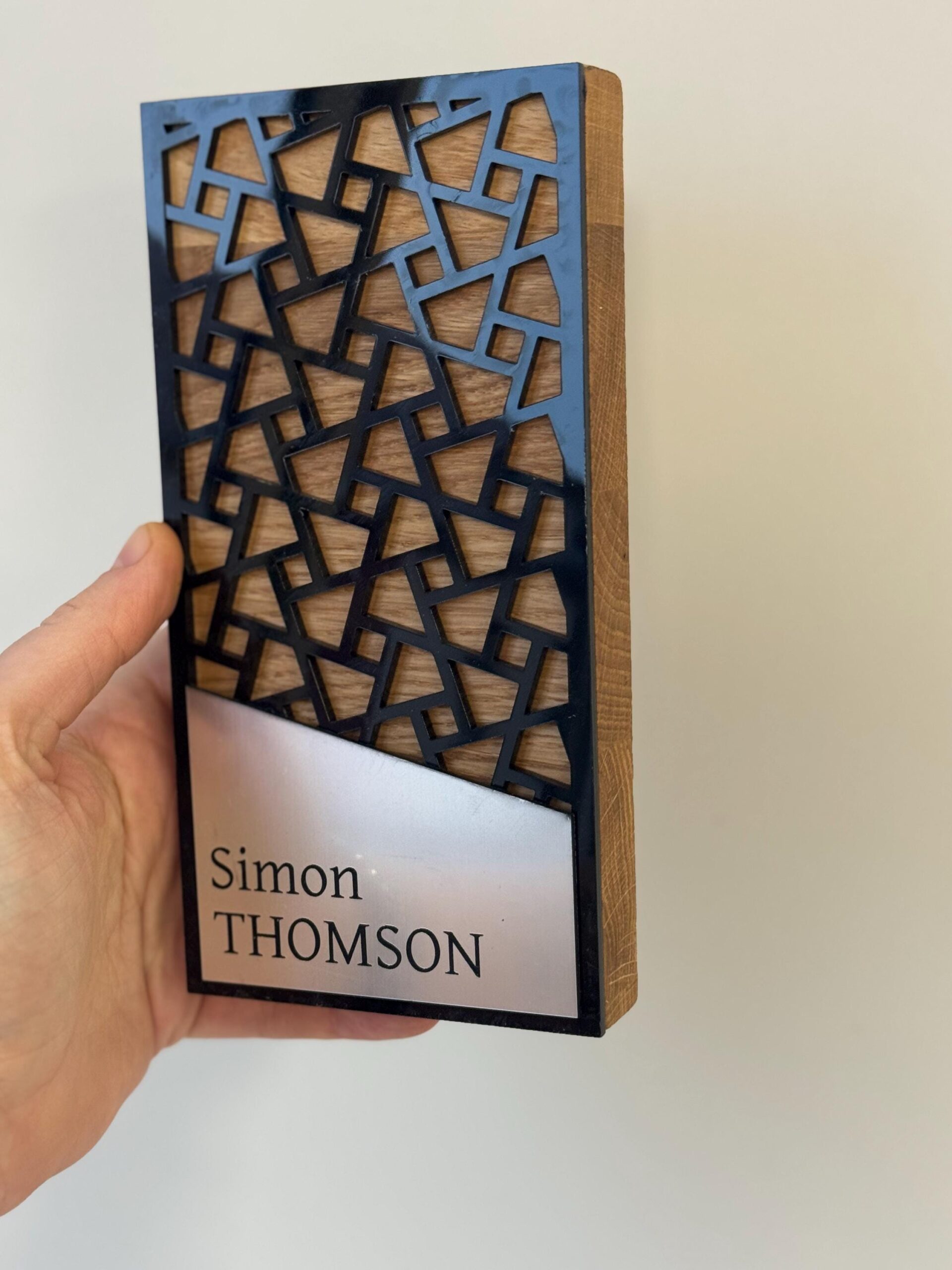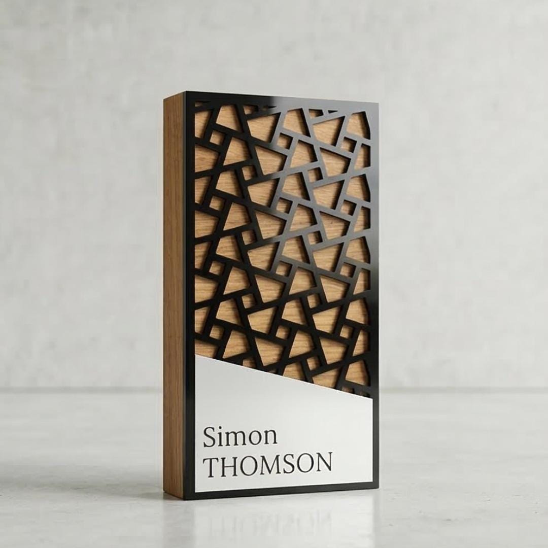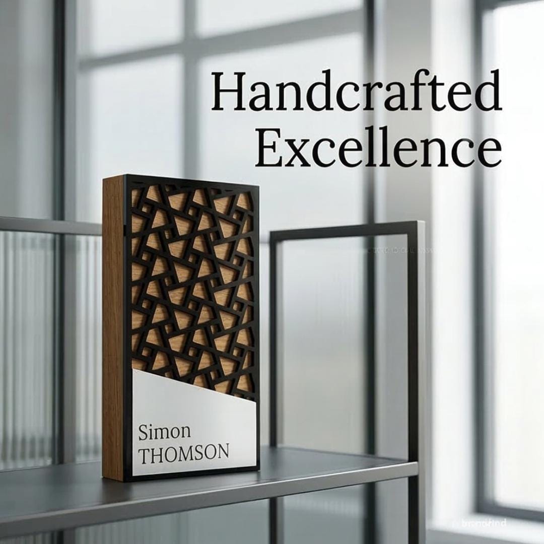 Apatinėje dalyje integruota unikali asimetriška (trapecijos formos) plokštelė, skirta individualiam personalizavimui. Čia lazeriniu būdu graviruojami įmonių logotipai bei nugalėtojų vardai, taip užtikrinant kiekvieno prizo unikalumą. Tai idealus pasirinkimas lyderystės nominacijoms, verslo pasiekimų įvertinimui ar moderniems renginiams, kur vertinamas tvarumas, originalumas ir aukštoji estetika. Rankų darbo kokybė garantuoja, kad kiekviena detalė bus išpildyta nepriekaištingai.