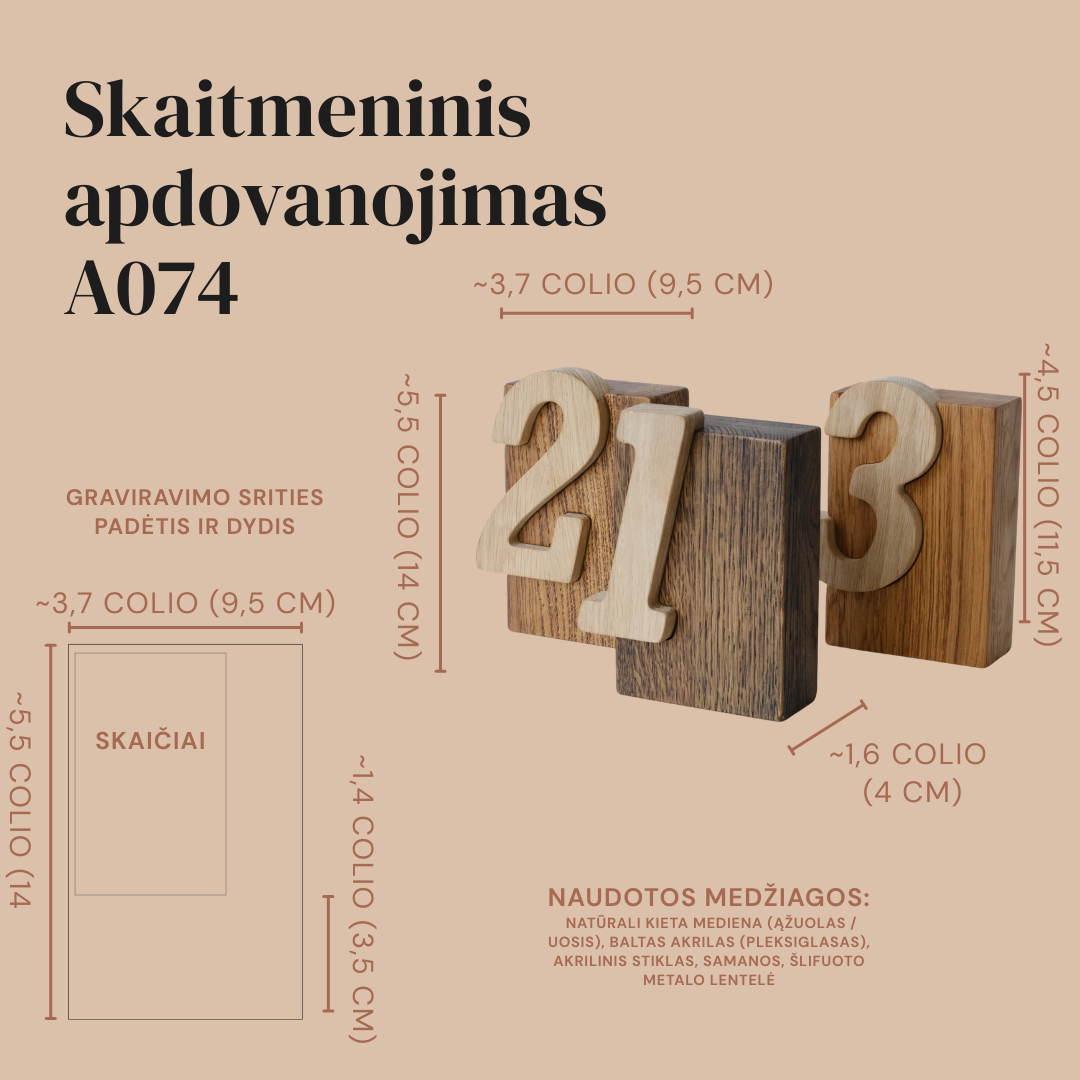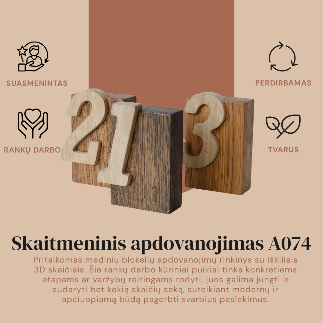 Modernaus dizaino apdovanojimų komplektas, skirtas prizinėms vietoms turnyruose, varžybose ar įmonių konkursuose pažymėti. Pagrindinis šių prizų akcentas – išraiškingi, lazeriu pjauti skaičiai 1, 2 ir 3, kurie aiškiai identifikuoja pasiekimą. Gaminiai gali būti gaminami iš skirtingų medžiagų sluoksnių: pavyzdžiui, skaidraus akrilo siluetas ant tvirto medinio pagrindo arba spalvoto akrilo deriniai, atitinkantys aukso, sidabro ir bronzos spalvų gamą. Individualus graviravimas ant kiekvienos statulėlės leidžia nurodyti renginio pavadinimą, kategoriją bei datą. Dėl savo vertikalios formos ir aiškios simbolikos, šie apdovanojimai puikiai atrodo nugalėtojų nuotraukose ir suteikia ceremonijai profesionalumo. Tai universalus sprendimas, tinkantis tiek sporto, tiek verslo ar pramogų pasaulio apdovanojimams.