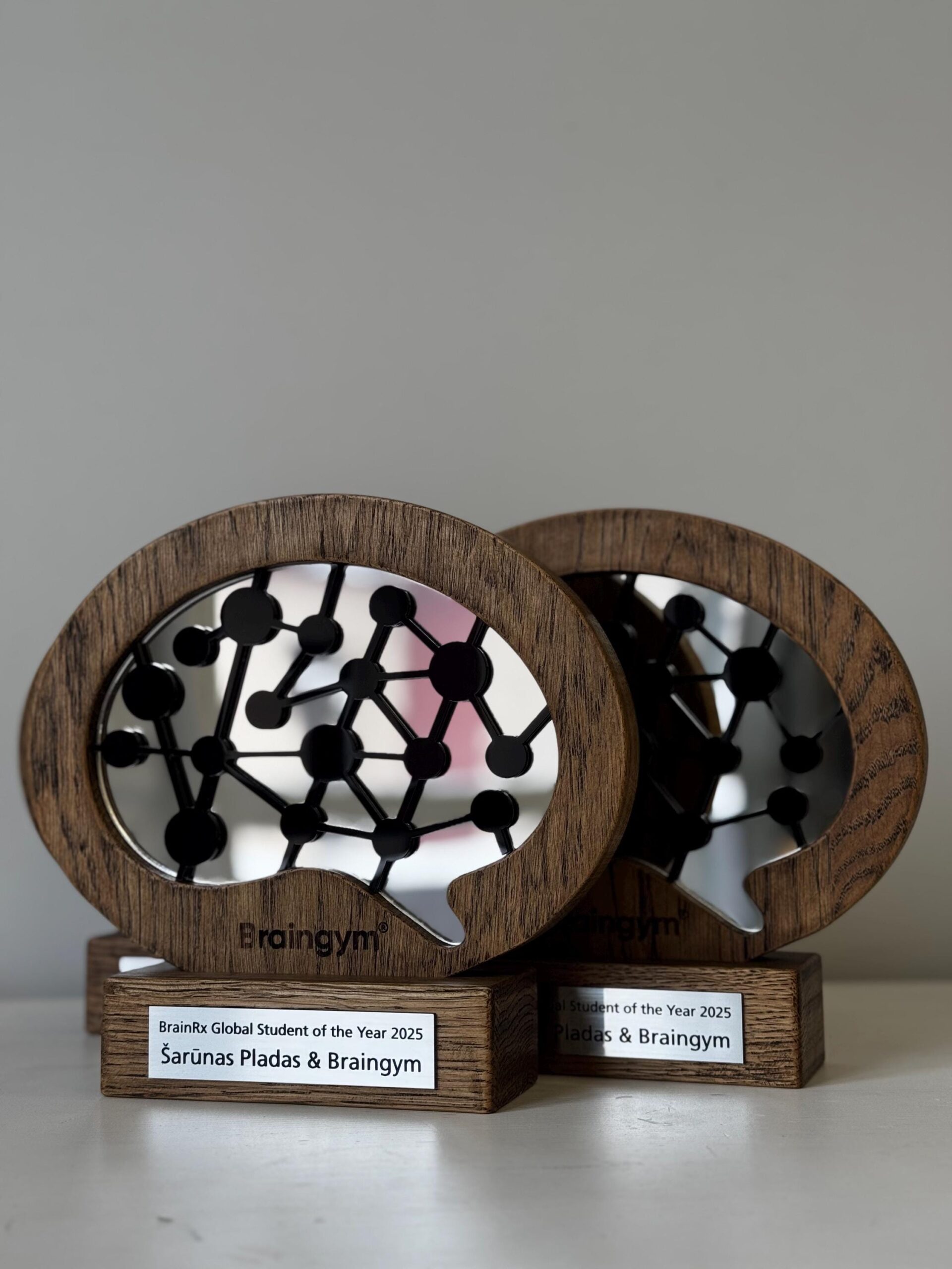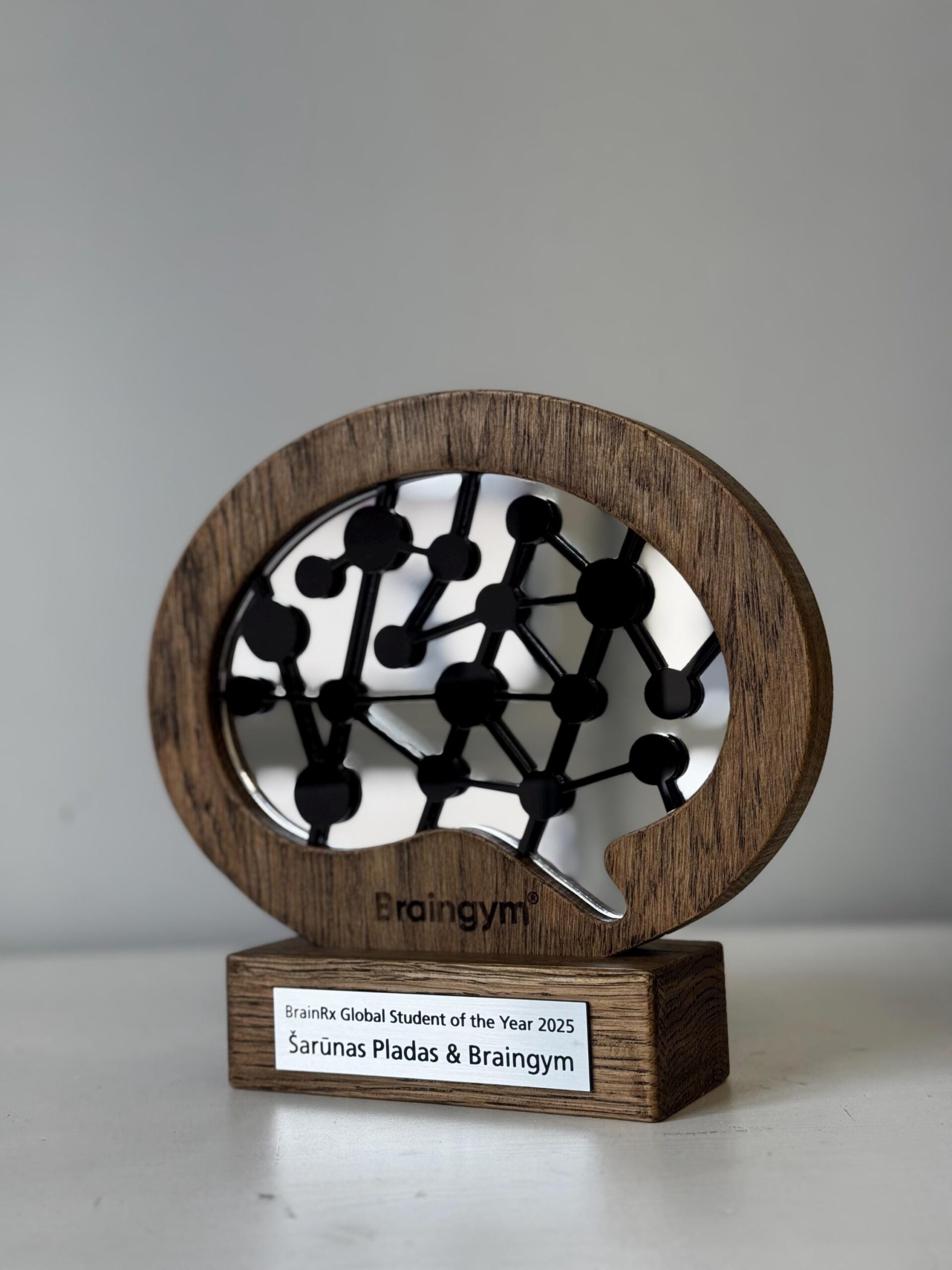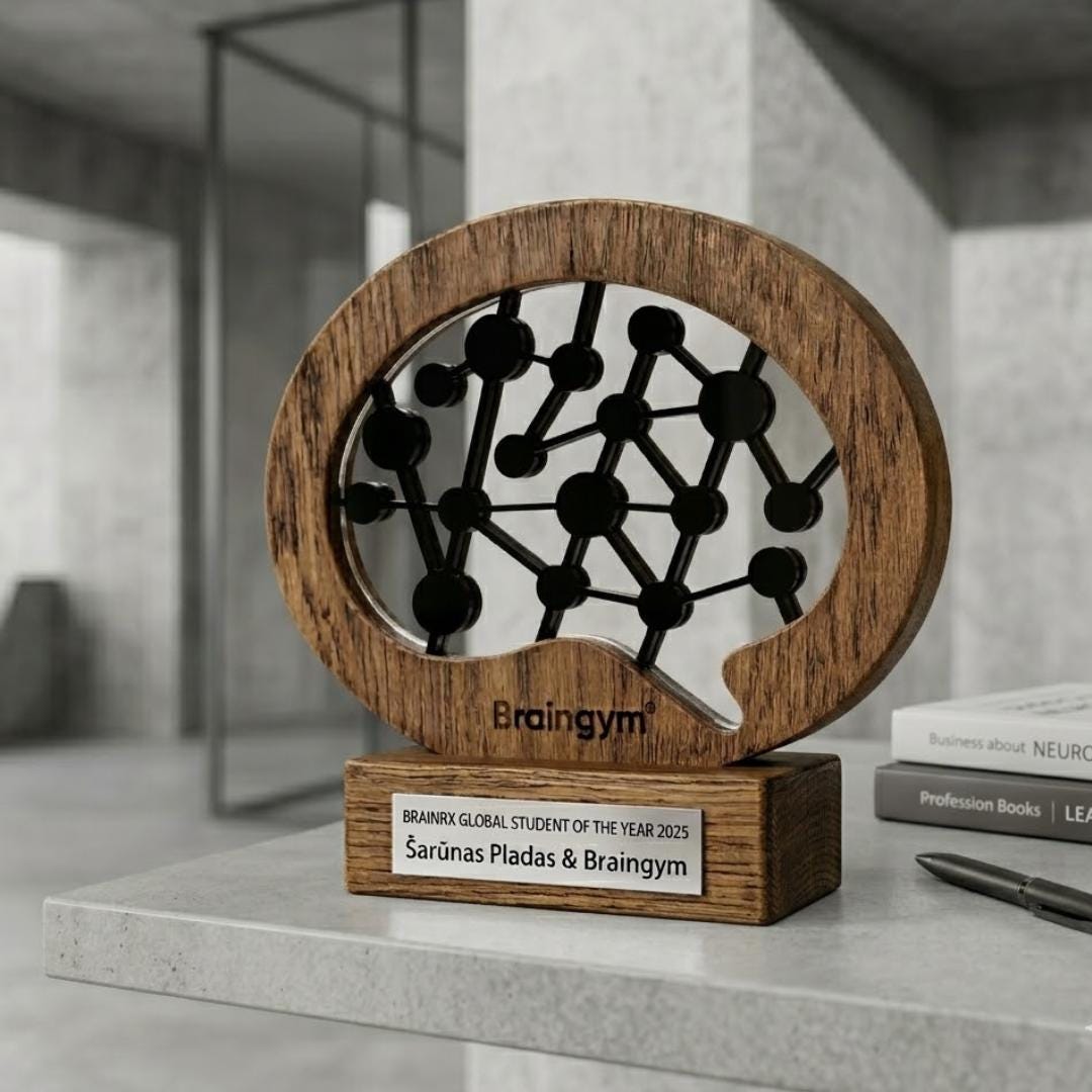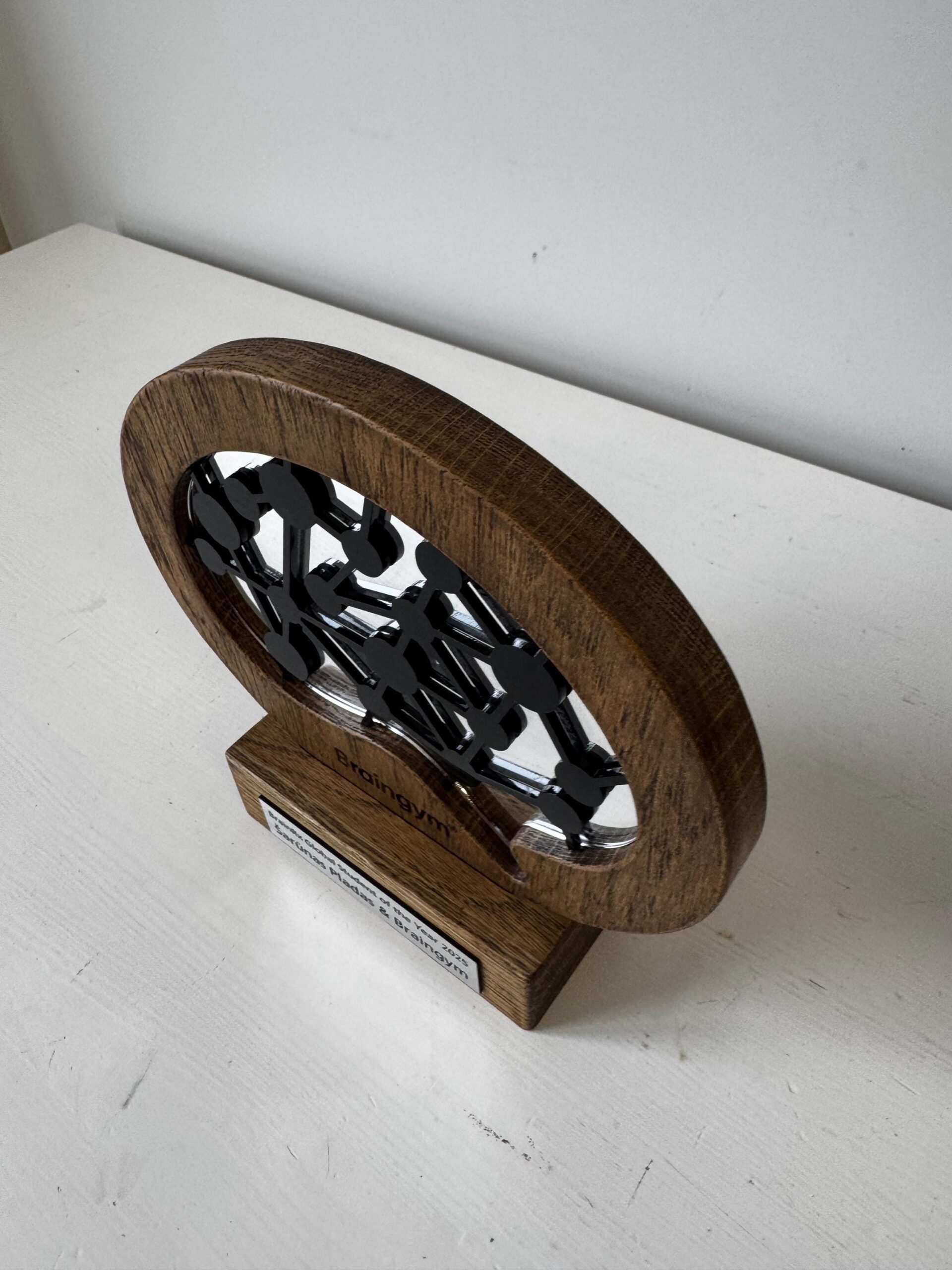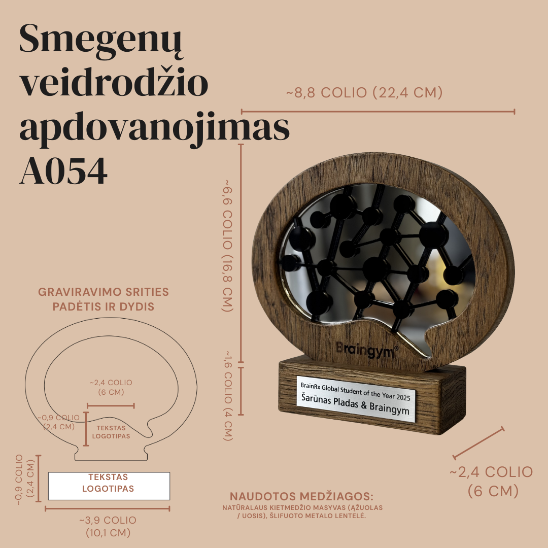 Apdovanojimas pasižymi dvigubo personalizavimo galimybe: įmonės logotipas gali būti lazeriu graviruojamas tiesiai ant medinio rėmo, o detali informacija apie nugalėtoją įamžinama ant šlifuoto metalo lentelės, esančios ant tvirto pagrindo. Solidus 20,8 cm aukštis ir architektūrinė forma užtikrina, kad trofėjus taps bet kurios vitrinos ar darbo stalo akcentu. Tai idealus pasirinkimas neuromokslų, psichologijos, IT technologijų, edukacijos srities profesionalams ar studentams pagerbti, kartu deklaruojant pagarbą tvarumui ir natūralioms medžiagoms.