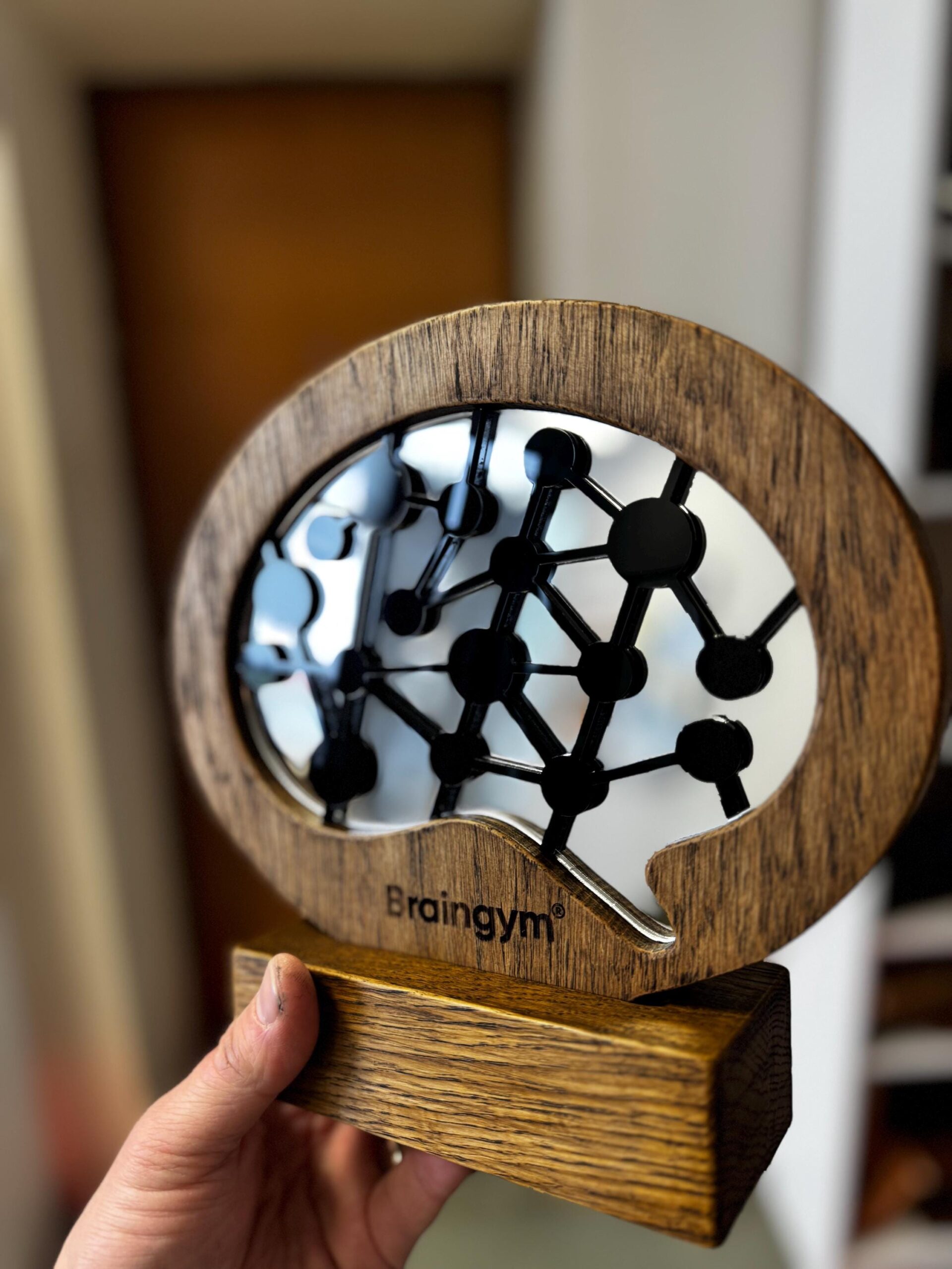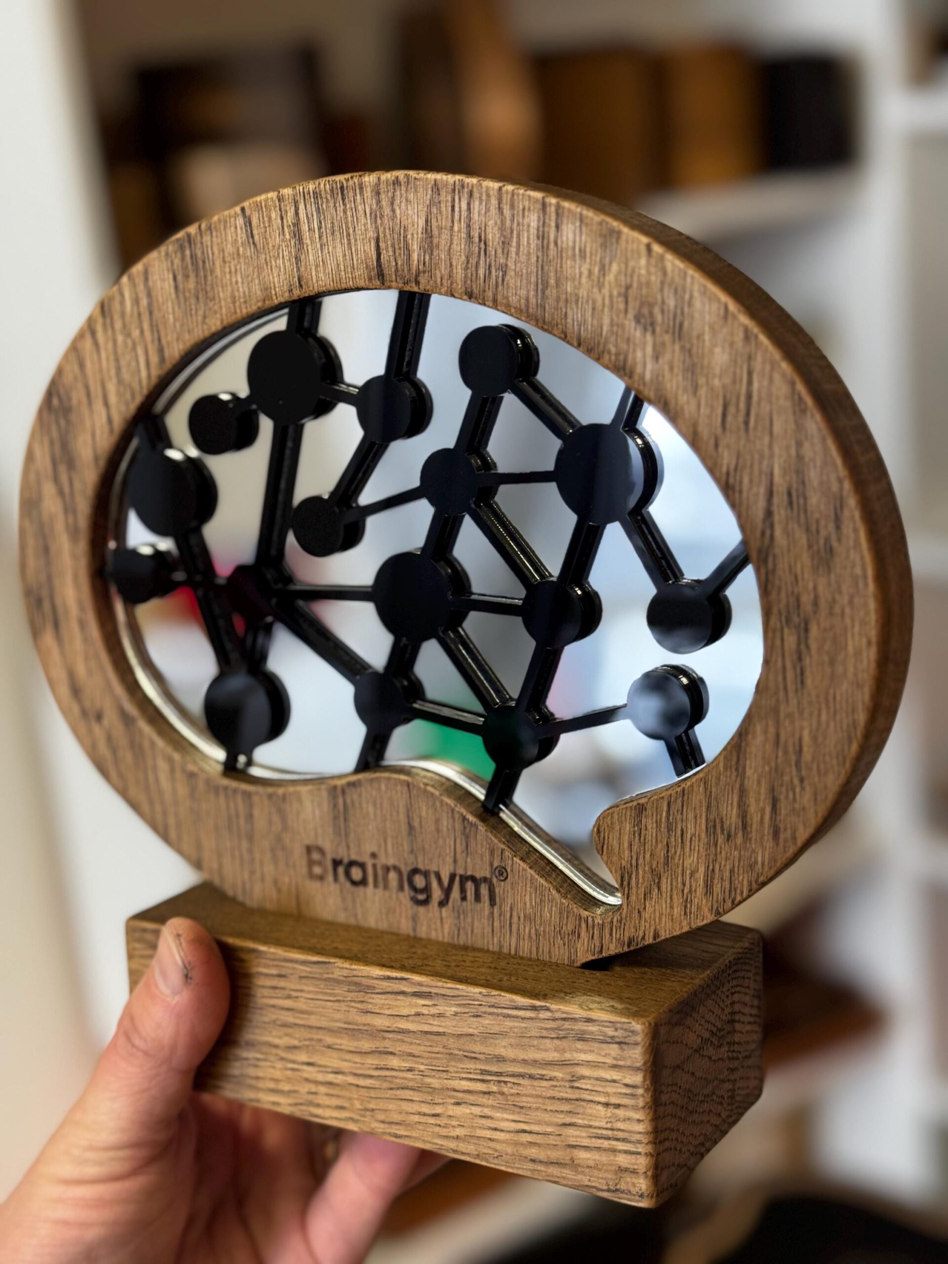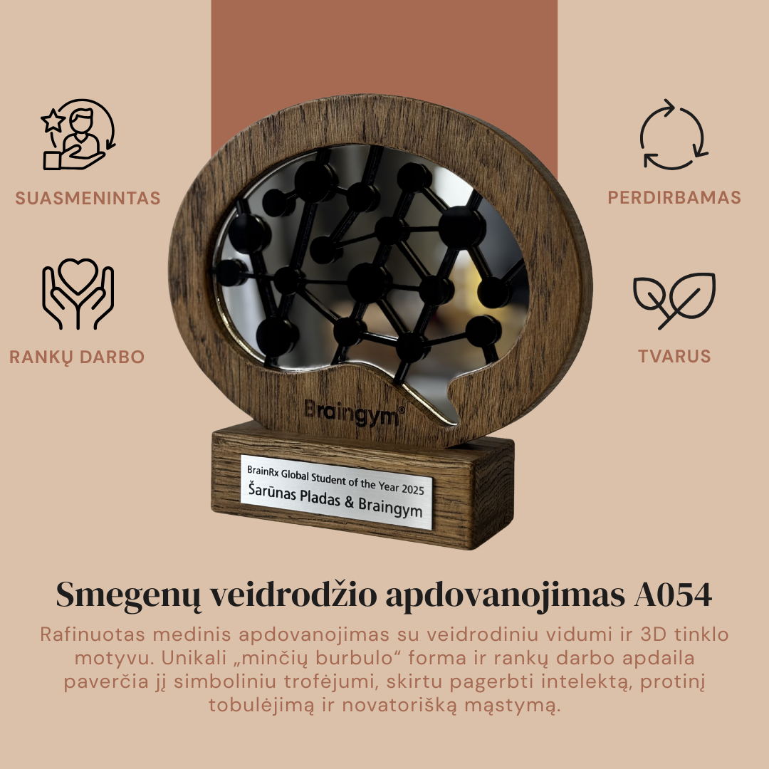 Išskirtinis medinis apdovanojimas „Smegenų veidrodis A054“ yra intelektualumo, savirefleksijos ir inovatyvaus mąstymo simbolis. Šis unikalus prizas gaminamas iš natūralaus kietmedžio masyvo (ąžuolo arba uosio), pasižyminčio solidžiu architektūriniu svoriu ir švelnia tekstūra. Gaminio dizainas atkartoja smegenų siluetą, kurio viduje integruotas veidrodinis fonas su tūriniu 3D neuronų tinklo ar molekulinės struktūros motyvu. Šis elementas sukuria gylio pojūtį ir pabrėžia idėjų skaidrumą bei minties galią.