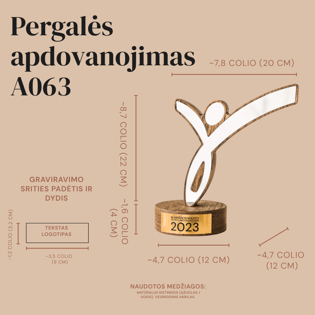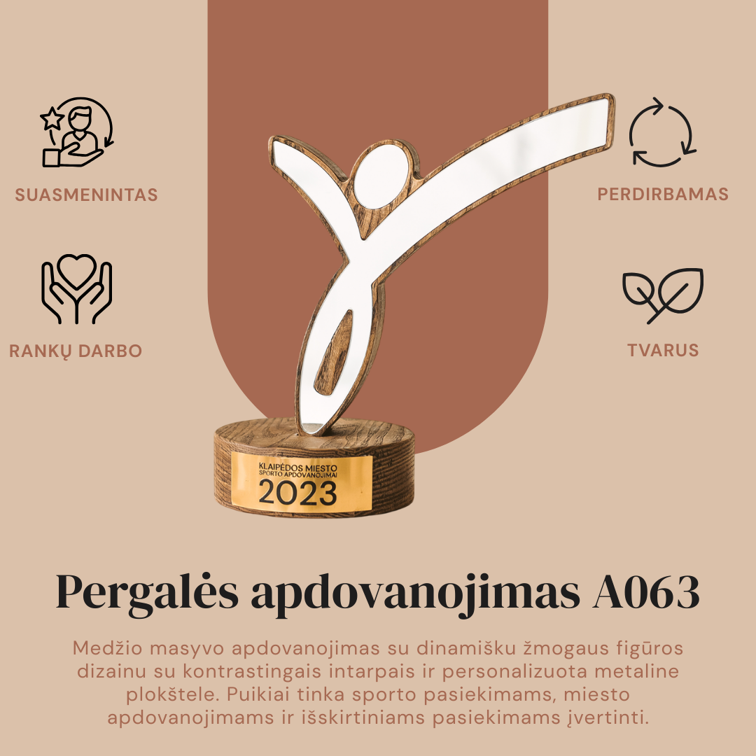 Išskirtinis šokių apdovanojimas, sukurtas siekiant įamžinti judesio grakštumą ir scenos energiją. Šis gaminys pasižymi dinamišku siluetu, kuris gali atkartoti baleto šokėjos, sportinių šokių poros ar modernaus šokio judesio linijas. Statulėlė gaminama derinant skaidrų, šviesą atspindintį akrilą ir natūralų medį, sukuriant vizualiai lengvą, tačiau stabilų trofėjų. Individualus dizainas leidžia integruoti specifinius šokio stiliaus elementus ar renginio logotipą. Lazerinis graviravimas ant akrilo paviršiaus arba medinio pagrindo leidžia tiksliai įrašyti nominaciją, šokėjo vardą bei turnyro pavadinimą. Tai estetiškas ir įkvepiantis prizas, kuris taps prasmingu prisiminimu apie scenoje praleistas akimirkas ir pasiektas pergales.