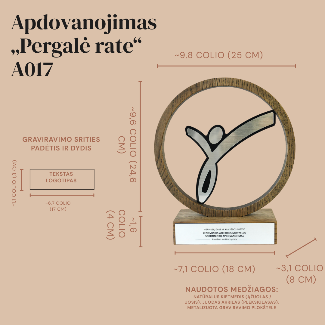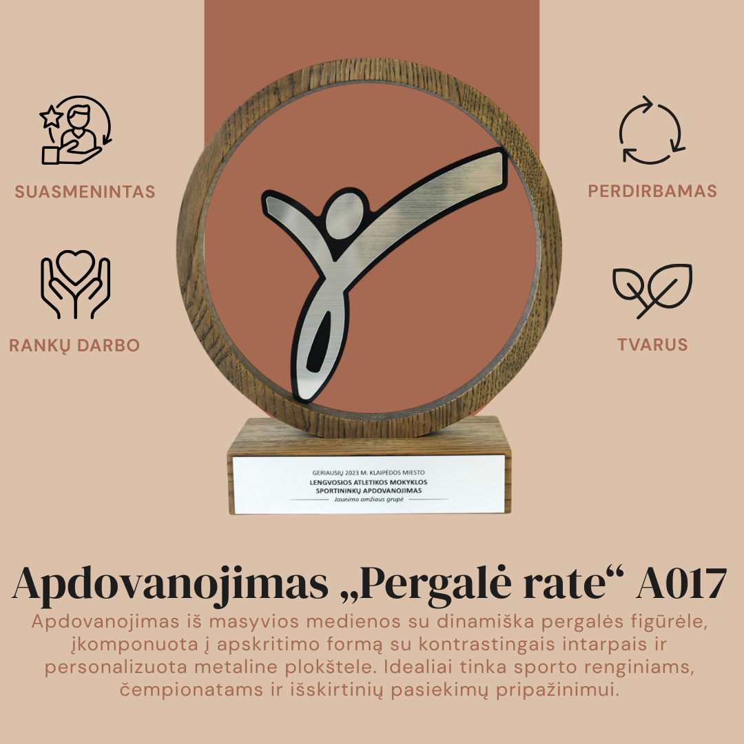 Šis modelis yra itin universalus – jis puikiai tinka lengvosios atletikos, gimnastikos, šokių ar individualių sporto šakų čempionatams. Apdovanojimas pasižymi tvarumu, nes yra pagamintas iš perdirbamų medžiagų. Ant plataus medinio pagrindo esanti metalinė plokštelė suteikia daug erdvės personalizavimui: čia galima preciziškai išgraviruoti turnyro pavadinimą, amžiaus grupę, užimtą vietą bei įmonių ar rėmėjų logotipus. Tai solidus ir įkvepiantis įvertinimas, pabrėžiantis sportininko meistriškumą.